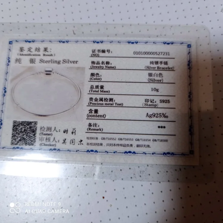 Браслет точно соответствует описанию изделия и соответствует указанному измерению. Серебряный номер сертификата выгравирован на брошке, плюс, продавец включает в себя карту, удостоверяющую, что браслет серебристый и маленькая замша для его очистки. Поэтому я рекомендую продавцу как для быстрой доставки, 7 дней, так и для деталей.