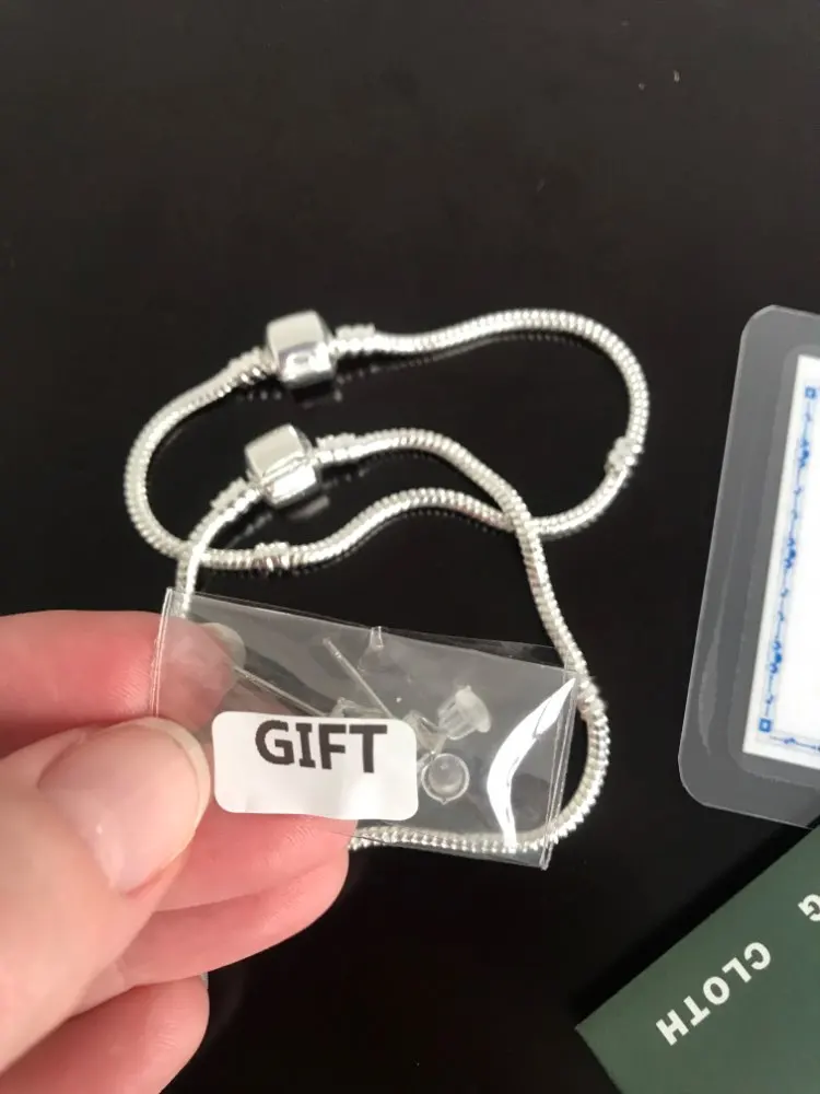 Шикарно) В подарок салфетка для полировки, приложен сертификат заламинированный, браслет упакован в мешочек. Видно, что продавец дорожит клиентом и любит свой бизнес. Всё аккуратно, соответствует описанию и очень бюджетно. Брала в комплект к двум родным Пандорам). Пакет шёл до МСК ровно три недели. Спасибо!