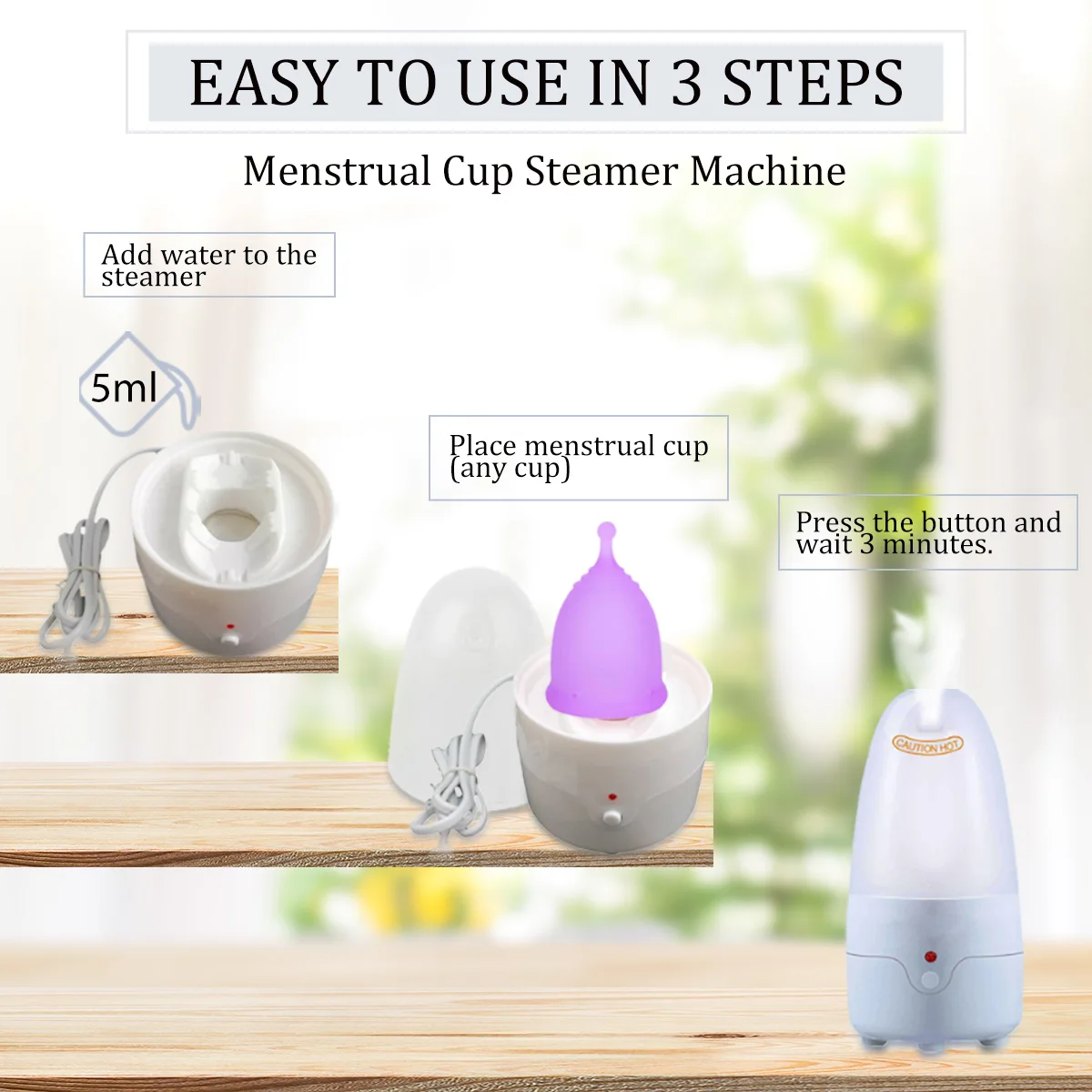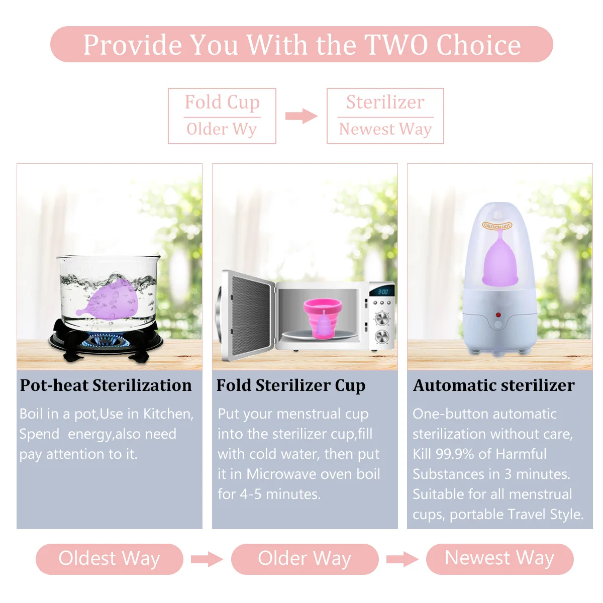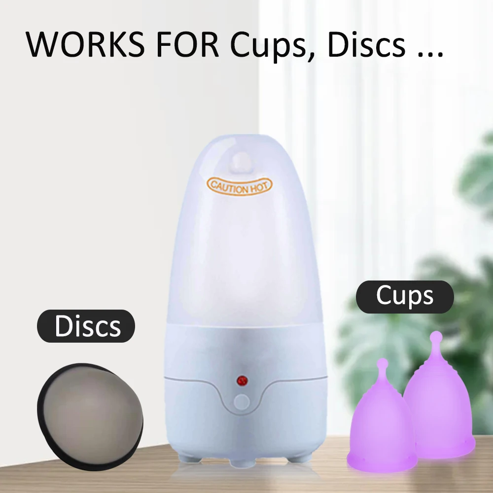 3-в-1 для очищает, высыхает и сохраняет ваш менструальная чаша. Очистите чашку периода всего за 3 минуты с помощью автоматического. Легко чистить чашку всего 3 шага! (Добавьте воду, Поместите чашку, нажмите кнопку)