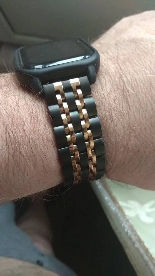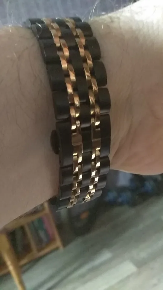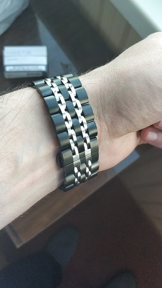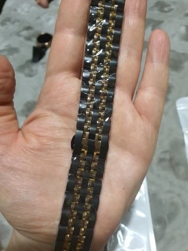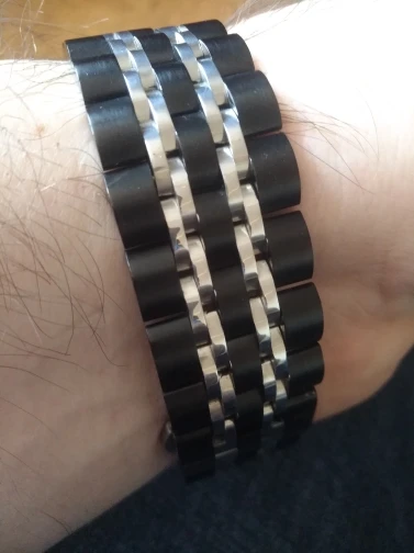 такое ощущение что чёрное покрытие не очень стойкое. есть затертости на гранях от соседних хромированных деталей, см фото. в целом за эти деньги браслет неплох. сточил под крепление 18мм. специально брал 22 для этого. широкий на мужской руке смотрится лучше.