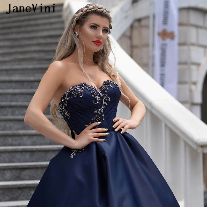 JaneVini Очаровательные темно-синие длинные платья для выпускного вечера 2020 трапециевидные милые атласные бальные платья длиной до пола с кристаллами и бусинами для торжественных случаев