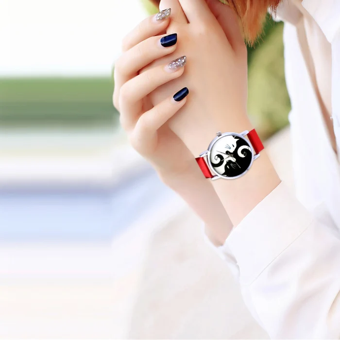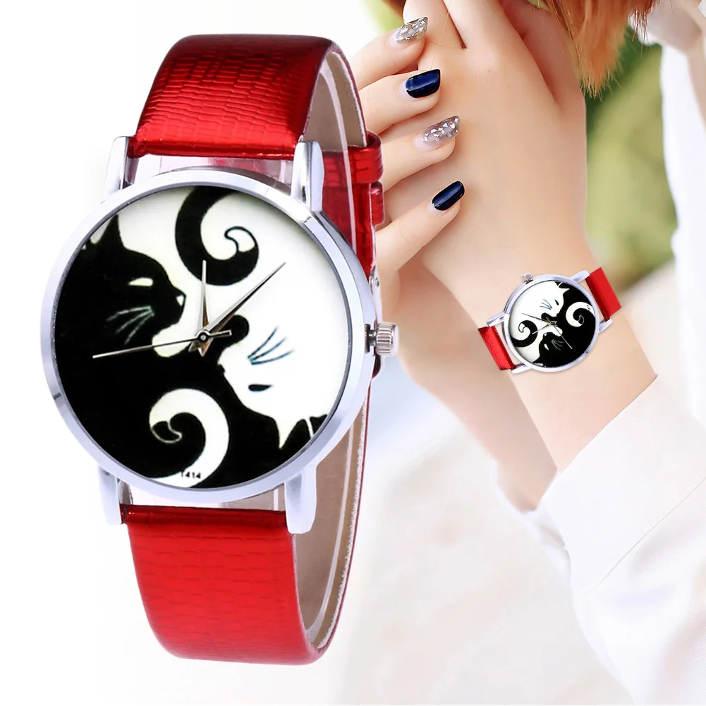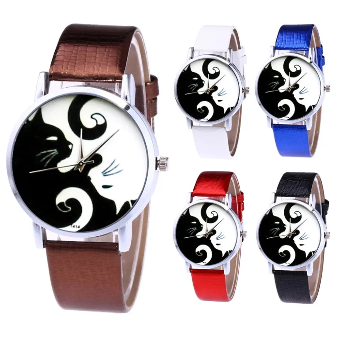 Наручные часы с изображением белых и черных кошек, LXH, из искусственной кожи ремешок и круглый циферблат