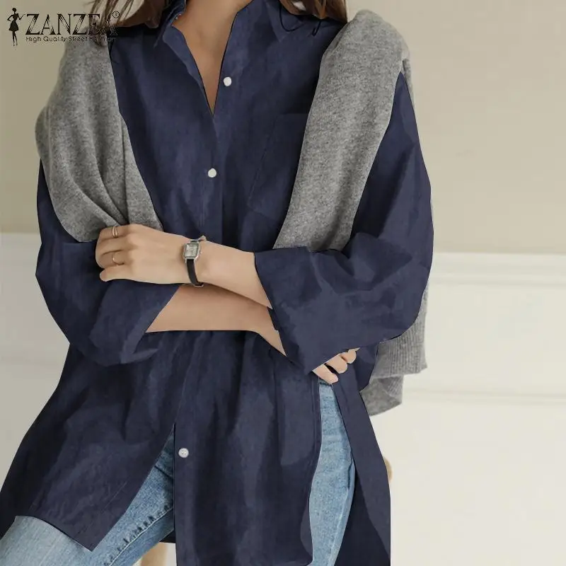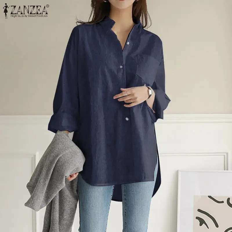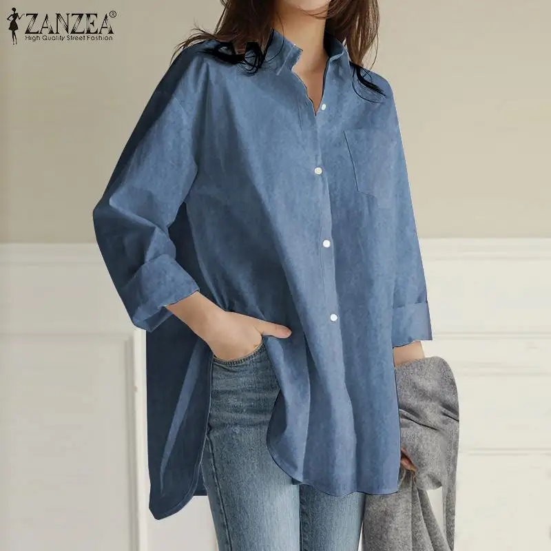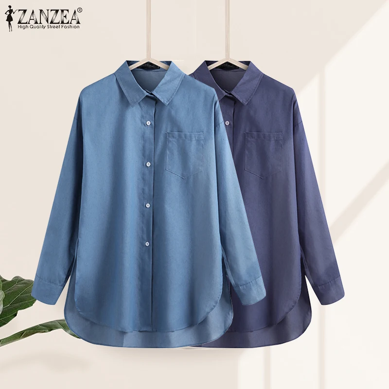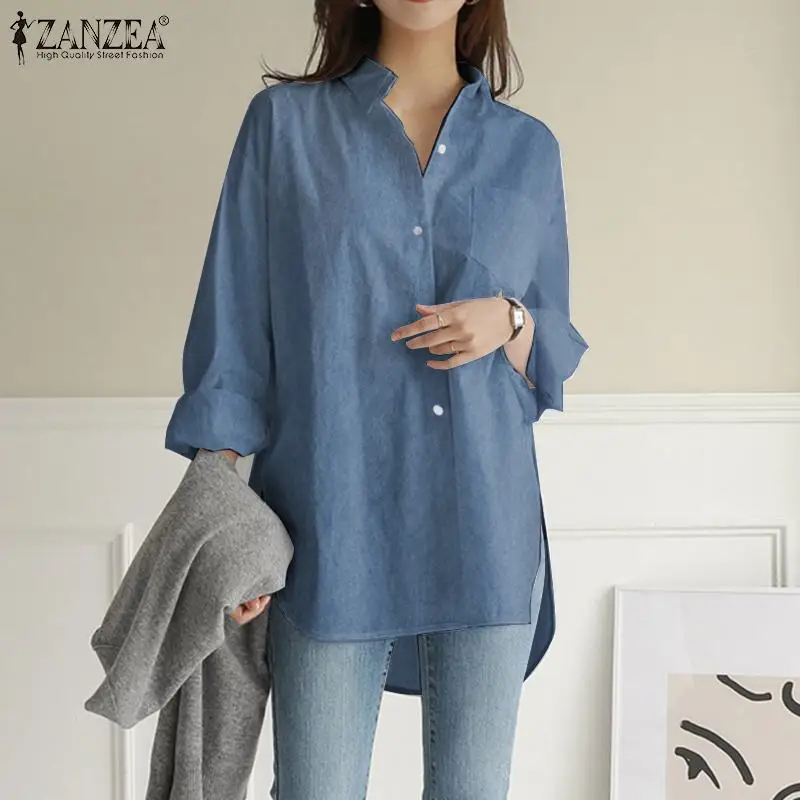 Блузка ZANZEA женская джинсовая с длинным рукавом, модная Базовая рубашка, синяя блузка с лацканами, осень 2021