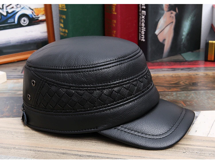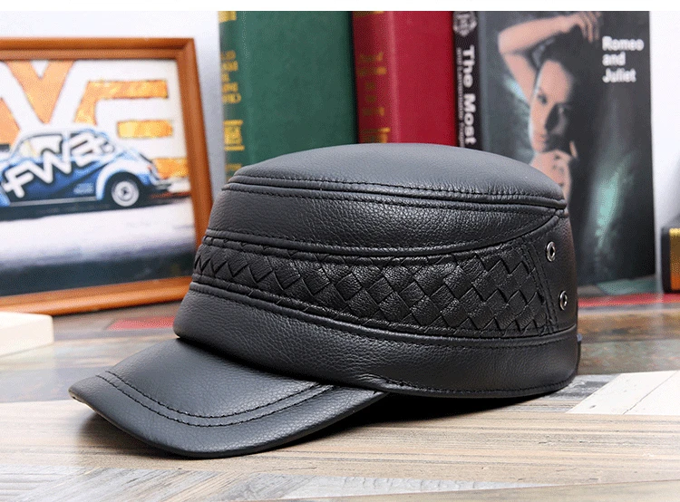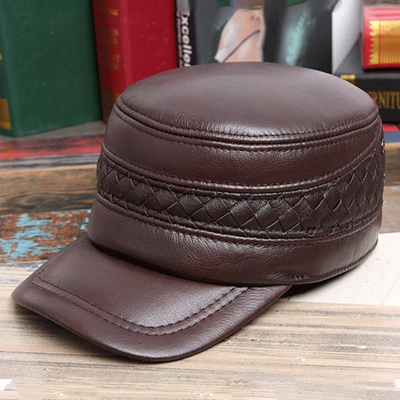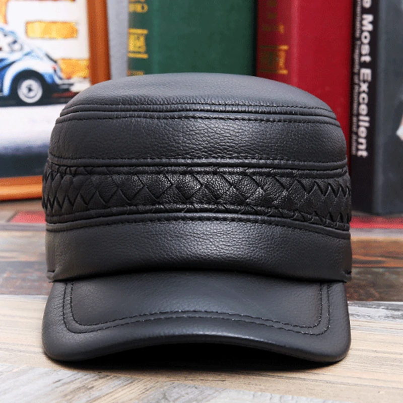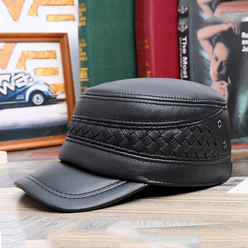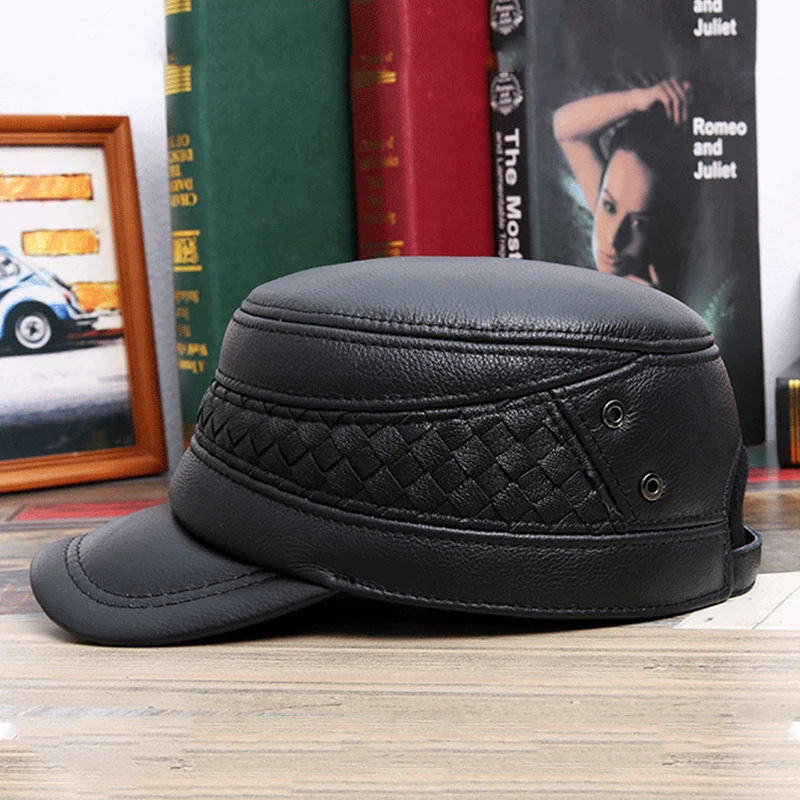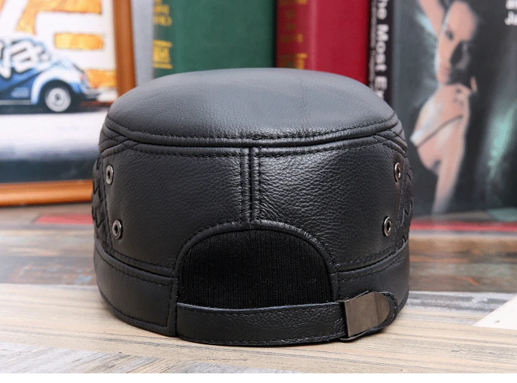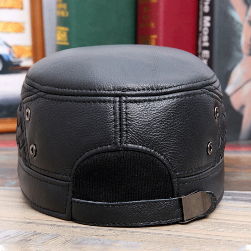 Мужская шапка из натуральной кожи на осень и зиму, военные шапки из воловьей кожи с ушами, регулируемый размер, плоская кепка, Мужская бейсболка