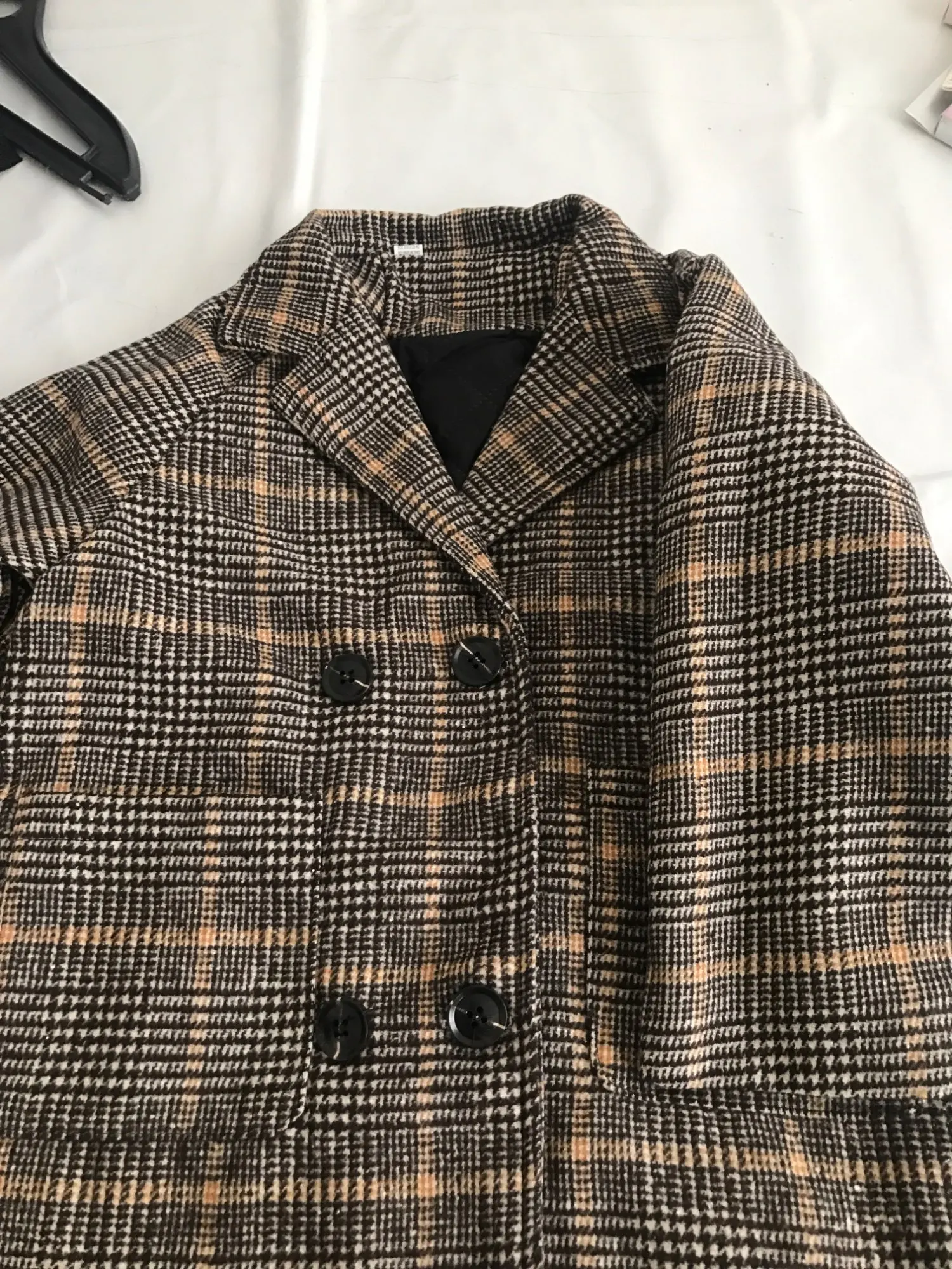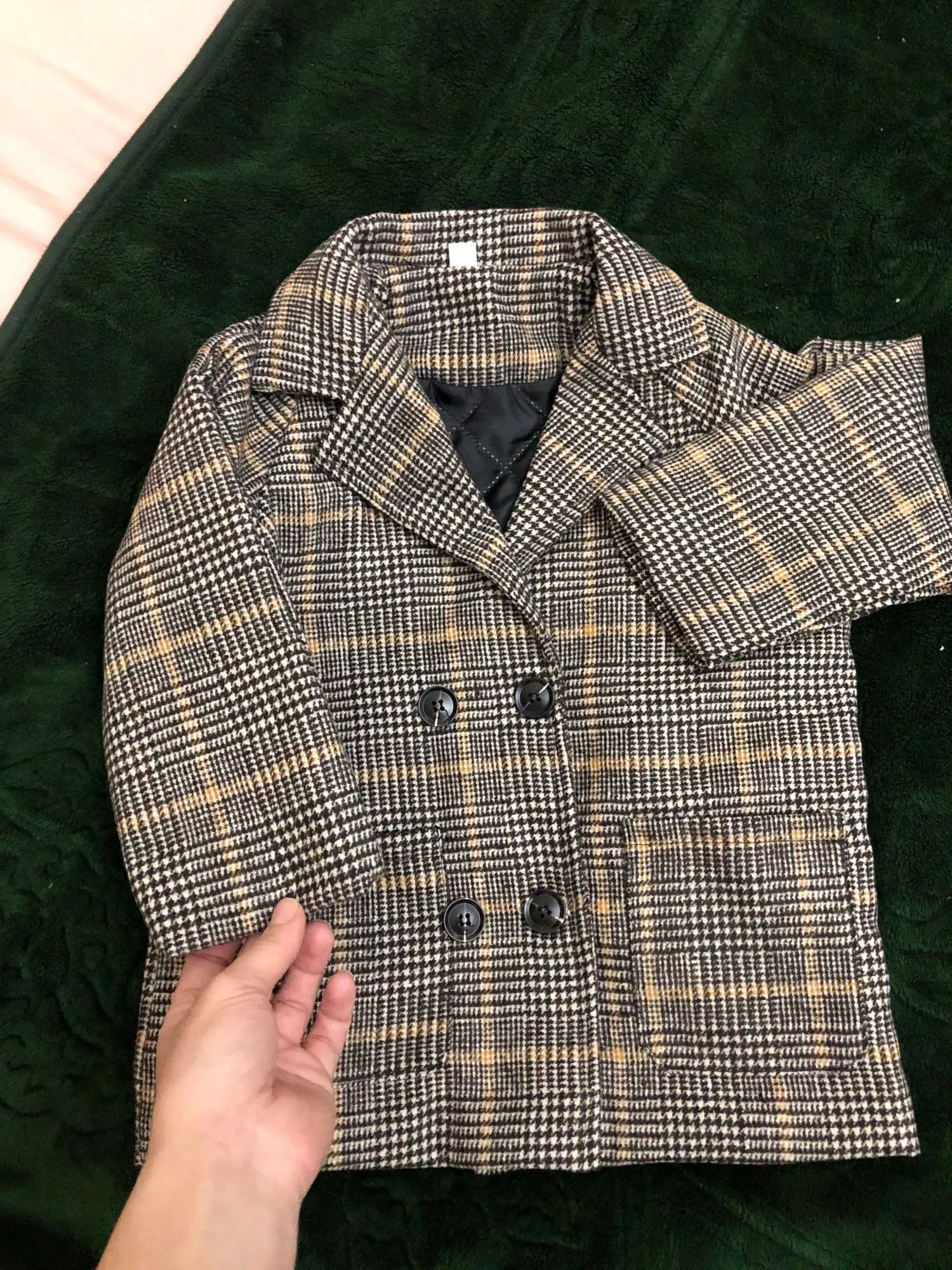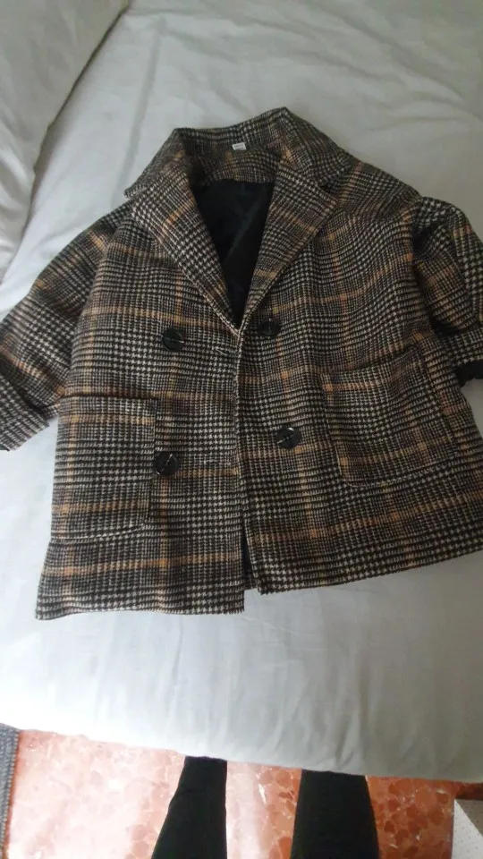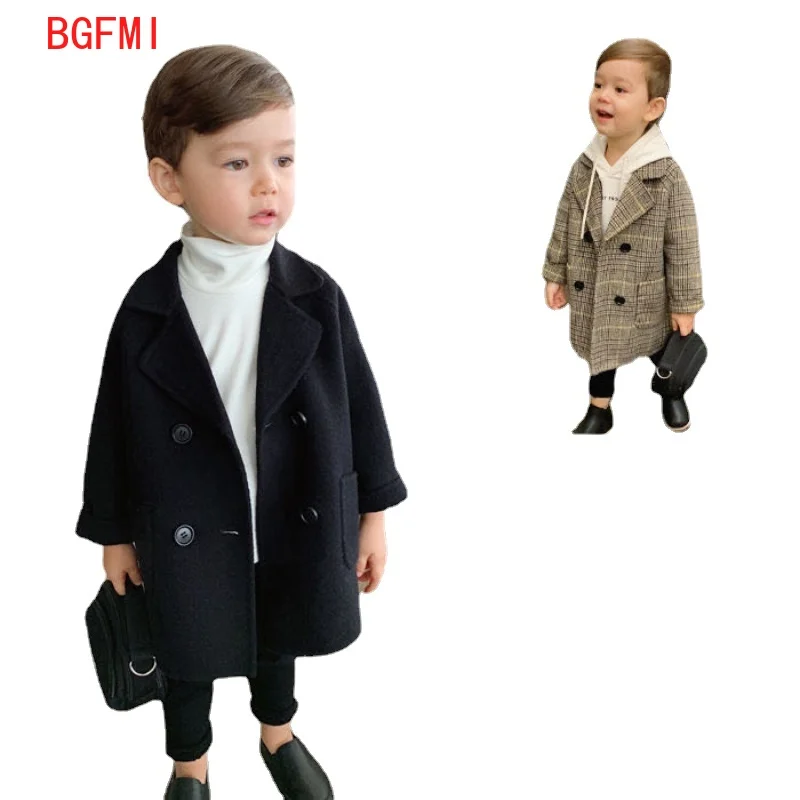 Куртка для мальчиков и девочек, шерстяная двубортная куртка в клетку с отворотом, Осень-зима, шерстяное пальто верхняя одежда