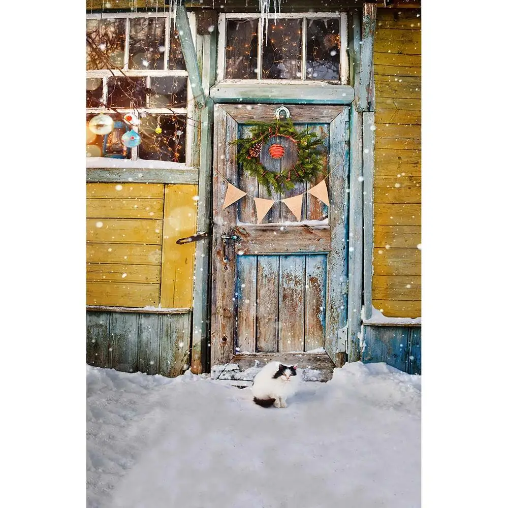 Виниловый фон для детской фотосъемки с изображением деревянной двери снега кота снега Рождества