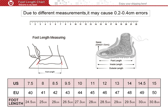 Длина стопы <длина стельки <длина подошвы Из-за разных настроек контрольного устройства, размер, возможно, имеет 0,2-0,4 см вследствие измерений вручную. Пожалуйста, выберите наш размер в соответствии с длиной стопы. Если вы не уверены, пожалуйста, свяжитесь со мной