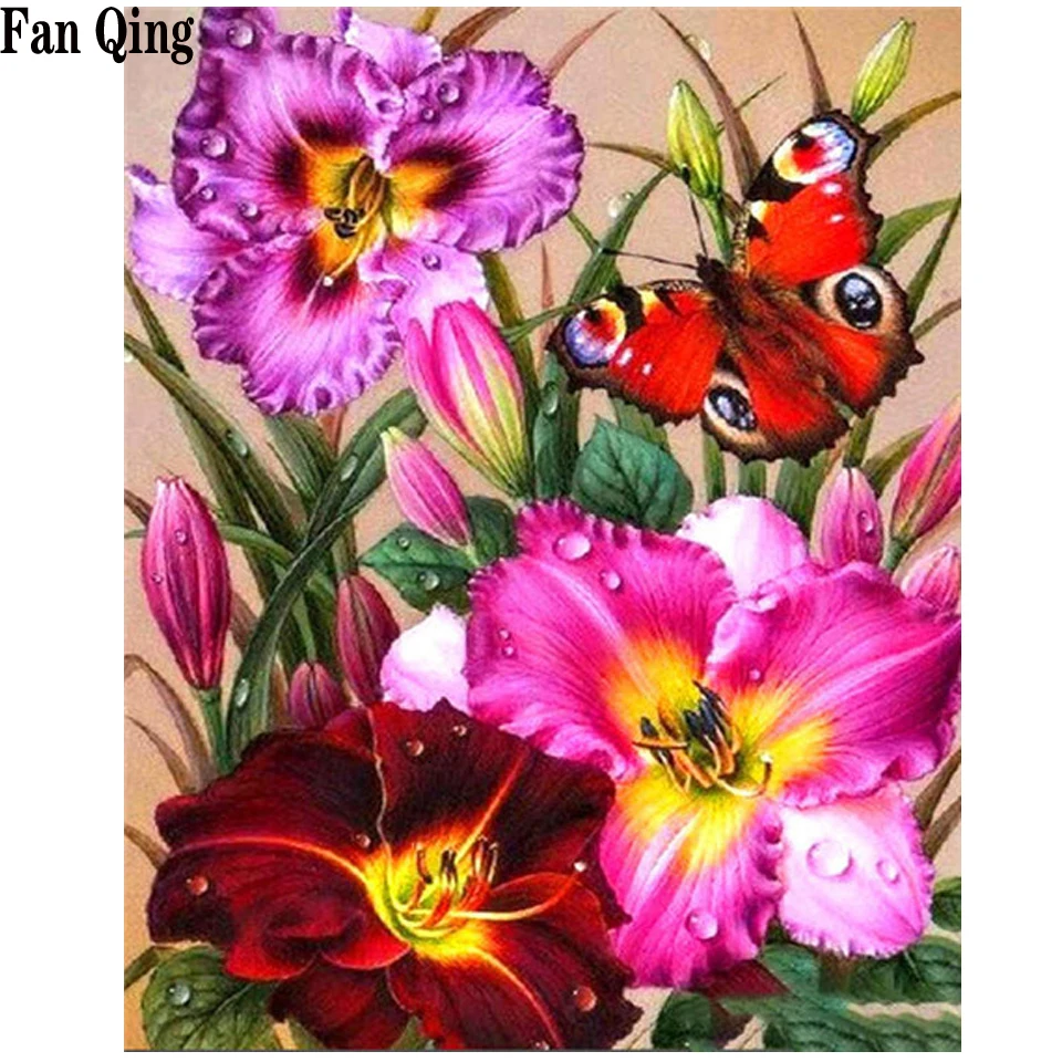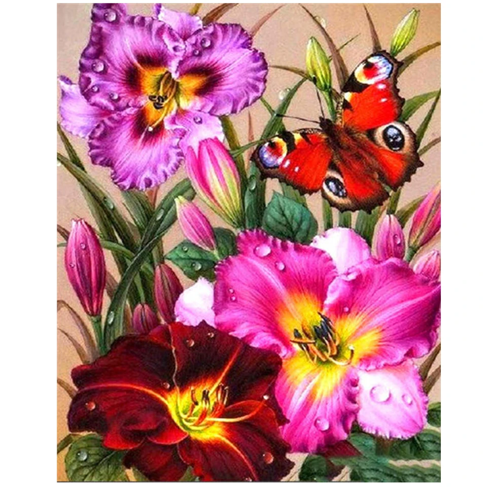 Алмазная 5d картина с цветами, лилией, бабочками, полноразмерная Алмазная вышивка сделай сам, вышивка крестиком, стразы, картины для домашнего декора