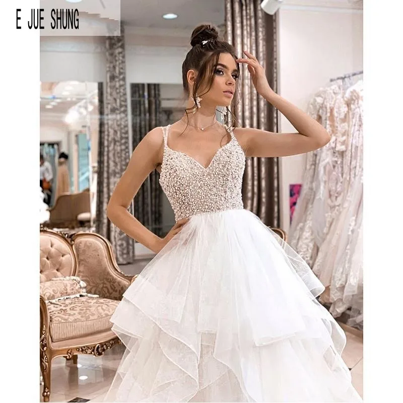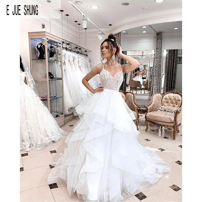 Роскошные свадебные платья E JUE SHUNG из органзы на тонких бретельках с V-образным вырезом и перекрещивающимися на спине кружевными аппликациями и оборками многоуровневые свадебные платья