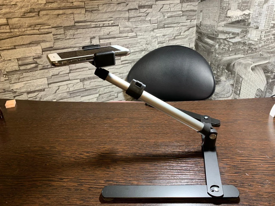 Штатив отличный! Регулируется положение от самого низкого (на поверхности стола) до вертикального. Ножки металлические. Работают как противовес.