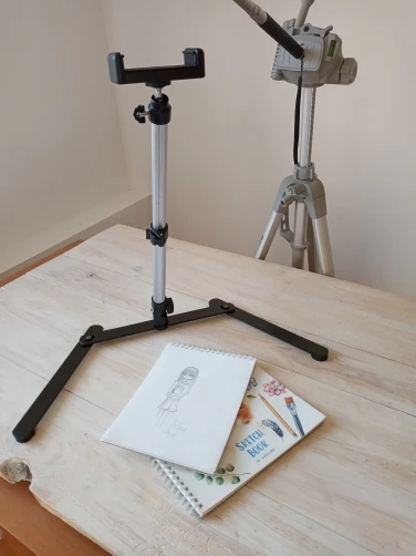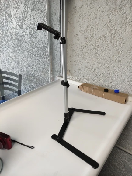 Коробка помятая, доставка около двух месяцев. Весь штатив исцарапан. Все крепления очень хлипкие. Качество ужасное. Снимать творчество неудобно (работаю со смолой и в технике флюид-арт), нужно что-то более качественное.
