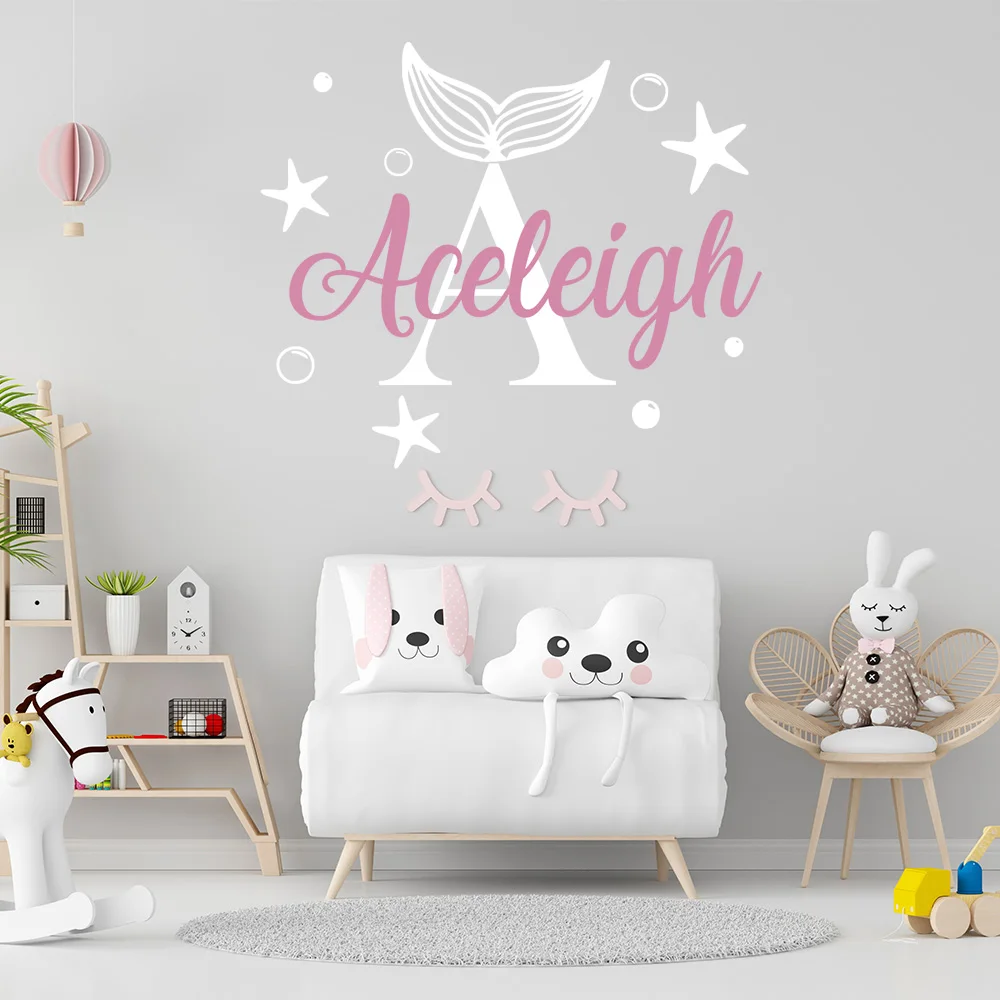 Персонализированная Наклейка на стену с именем русалки, художественные наклейки для детей, украшение для детской комнаты, виниловые Стикеры для декора обои