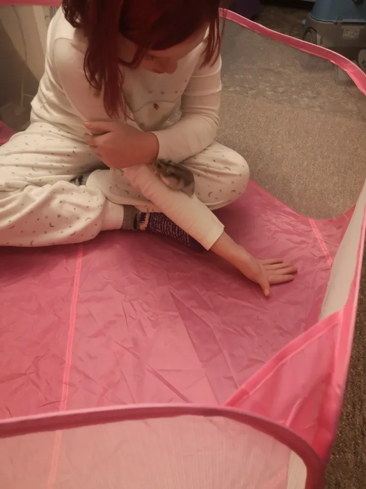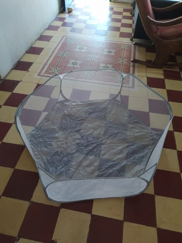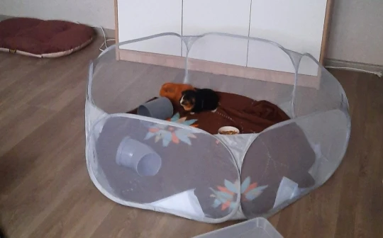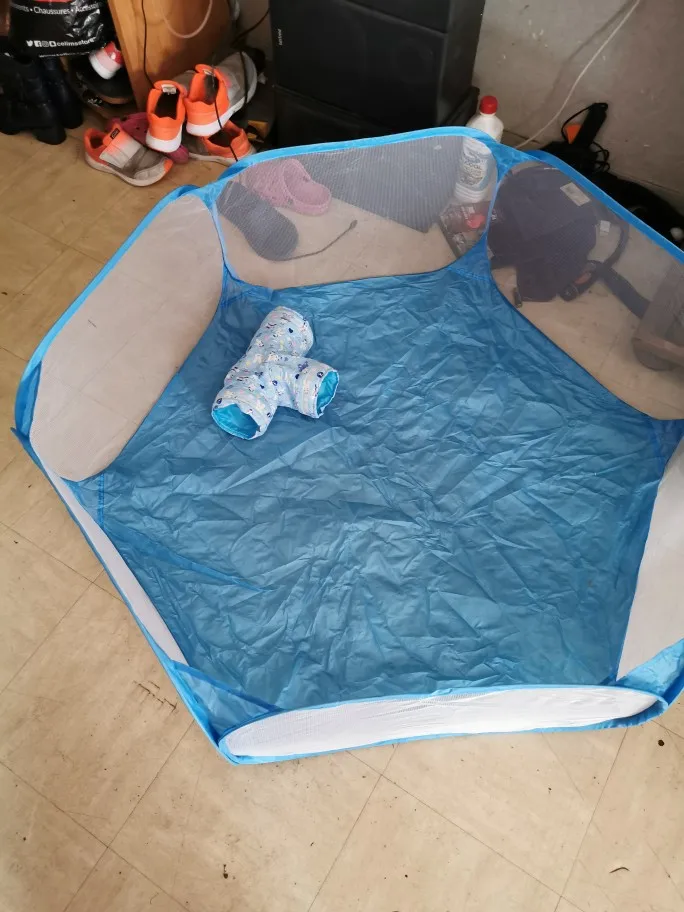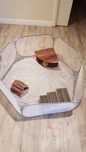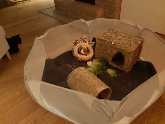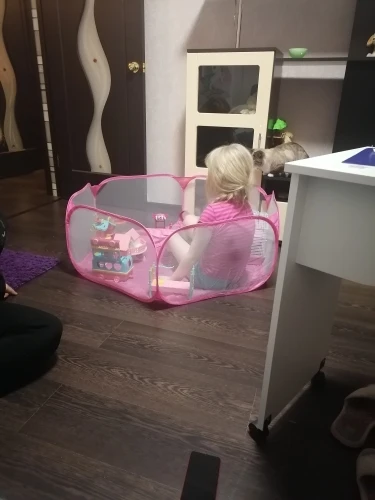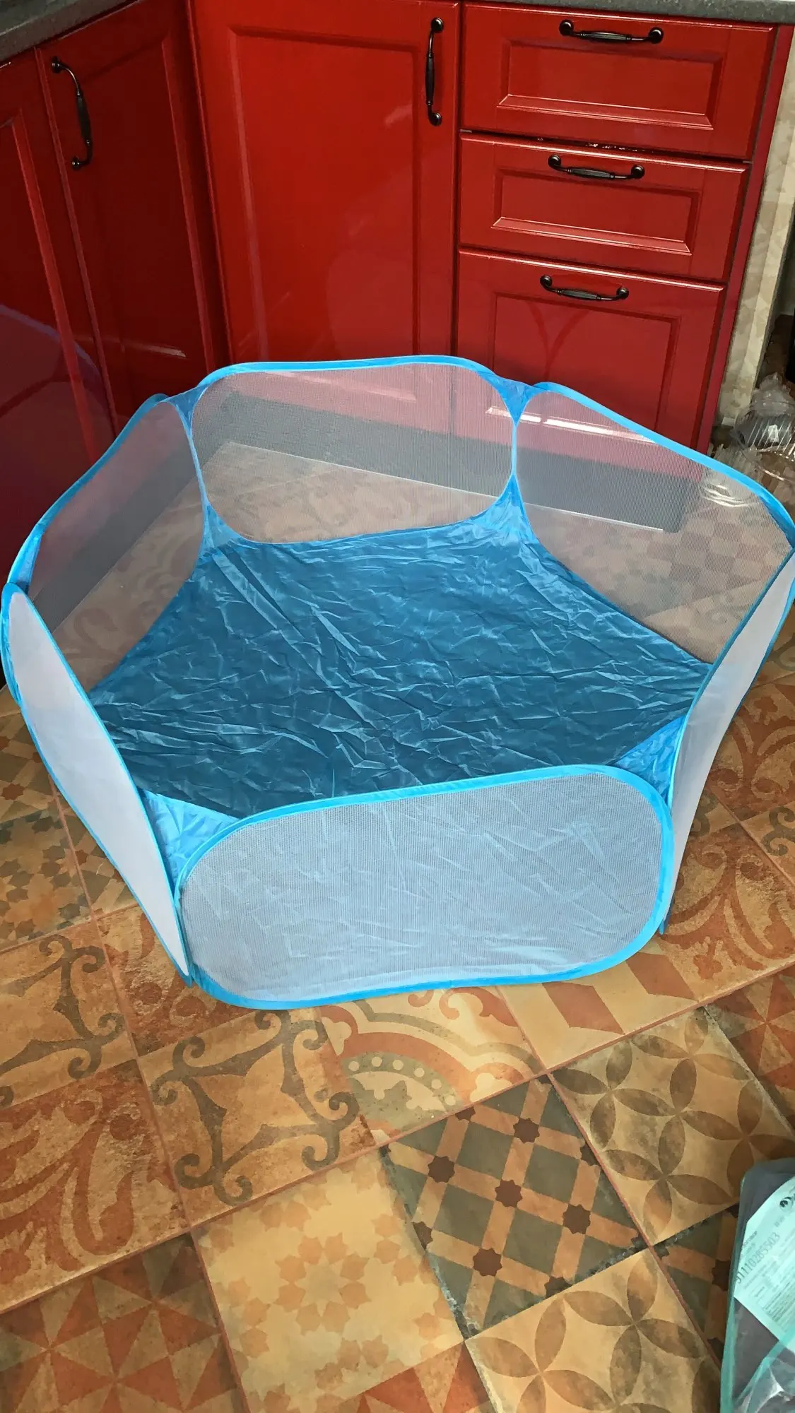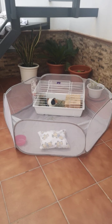 Очень хороший вольер, подходит не только животным, но и детям. У меня джунгарский хомяк, ему понравилось бегать в манеже. Стенки из сетки и хомяк может выбраться из манежа. Его легко собирать, в собранном варианте занимает мало места, можно брать с собой в парк что б выгуливать хомяка на сведём воздухе.
