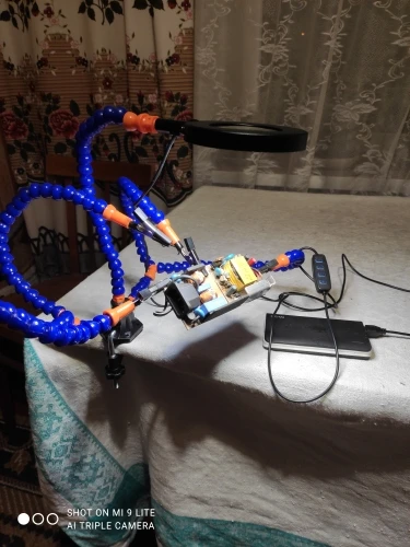 Хорошая поддержка при пайке. Удобная мощная лампа с хорошей линзой. Приятный свет с регулировкой яркости и теплоты. Холодный нейтральный теплый на выбор. Запасные крокодилы в комплекте. Удобный пульт на проводе лампы. Мощность около 5 Вт. Кронштейн лучше укрепить на саморезах, так как зажим не дает жесткости.