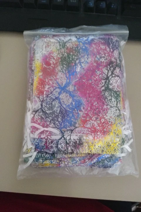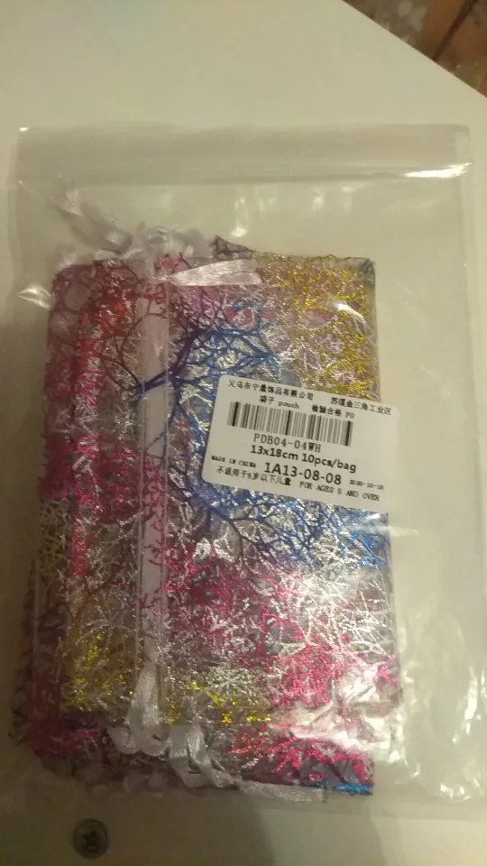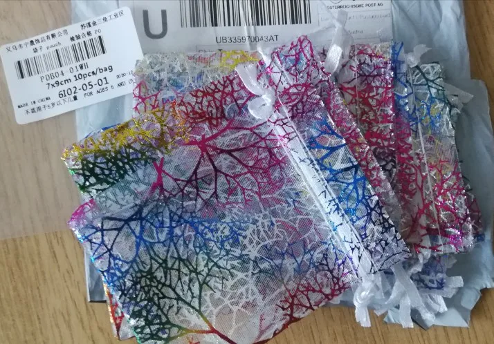 Заказ сделала 24.10.20г., посылка не отслеживалась. Пакет положили в почтовый ящик 24.12.20г.. Доставка 2 месяца. Заказывала мешочки белые и голубые размера 13х18см. Белые по высоте чуть меньше голубых. Размер в целом немного не соответствует, мешочки чуть меньше (12х17 см). Качество среднее, в некоторых мешочках атласная лента не до конца продета.