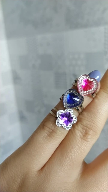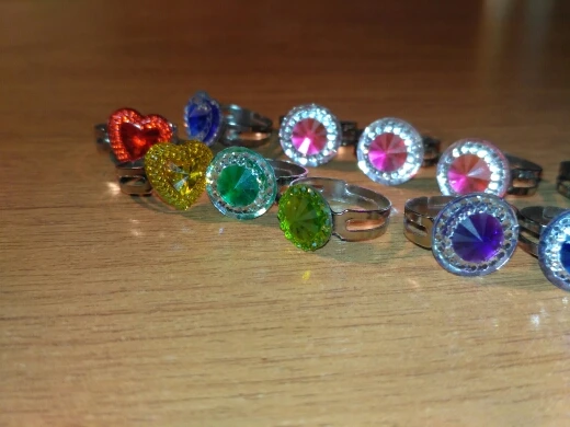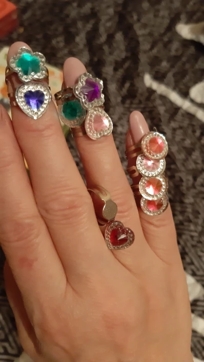 Простые колечки. Пластиковые стразы на металлическом растущем ободке. Хороший ассортимент. На 1 фото повтор первые три, на втором повтор голубое сердце. Качество на 3, выглядит дёшево, края не обработаны, есть следы литья. Но для маленькой девочки и за такую цену - хорошо. Игрушка, которую не жалко. Цвета разные, кольца можно менять всю неделю.