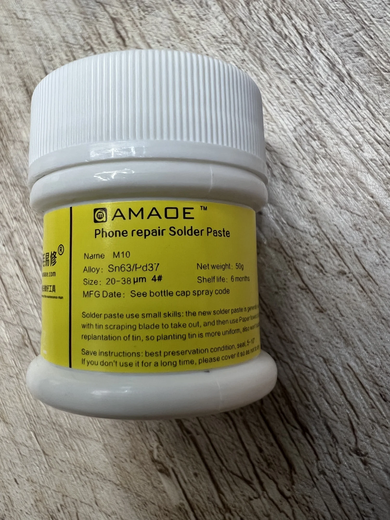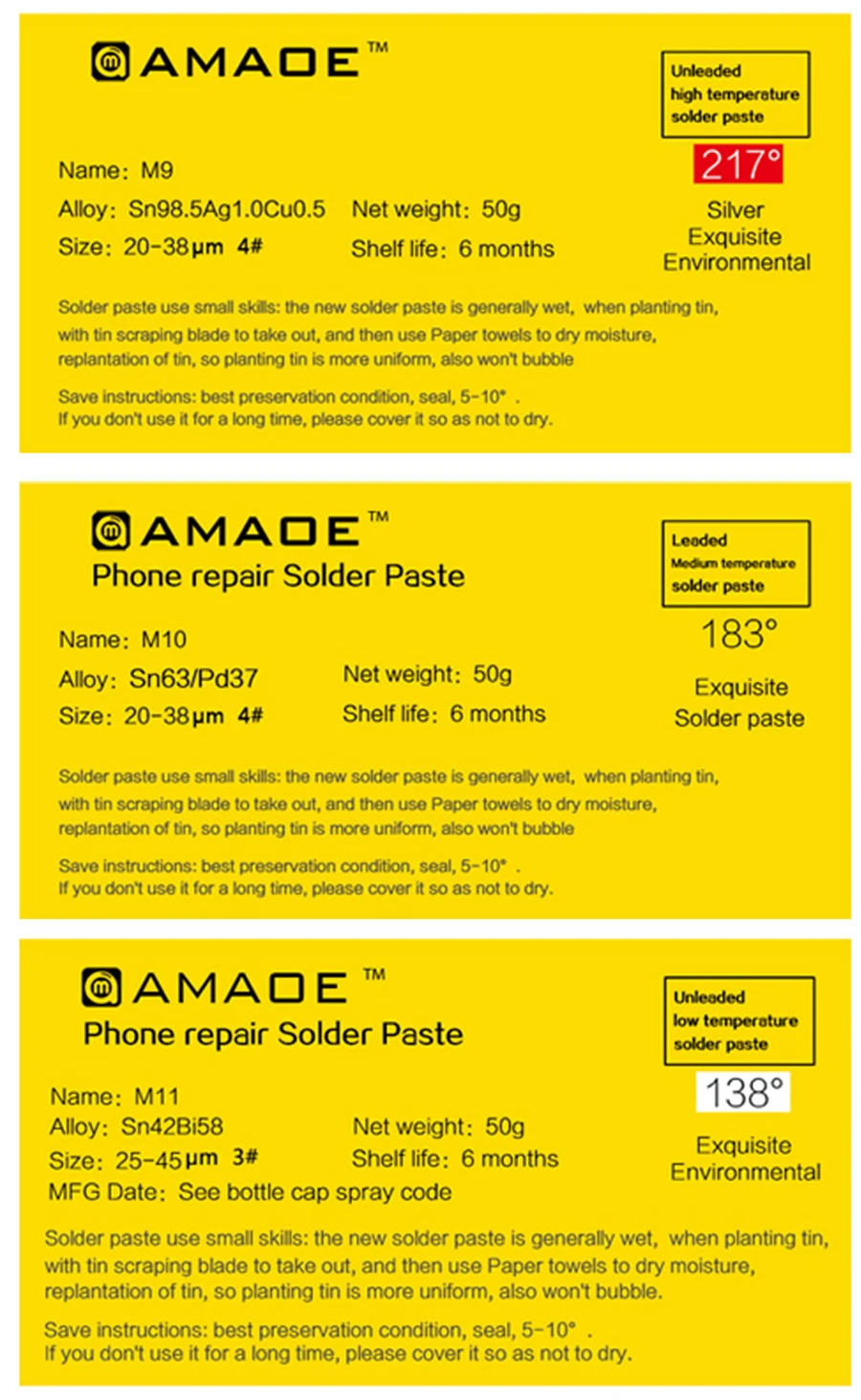 M11-lead-free низкотемпературная паяльная паста 138 °: Советы по использованию: подходит для ремонта мобильных телефонов, которые не могут выдерживать высокие температуры (например, лужение среднего слоя ремонта материнской платы телефона X), уменьшая проблемы с обслуживанием и снижая риск. Особенности: низкая температура 138 °, тонкая гладкая и хорошая липкая, Оловянное покрытие не пузырится, оловянные бусины однородные, уменьшают трудности в обслуживании, уменьшают риск, но прочность сварки не является средней и высокой температурой.