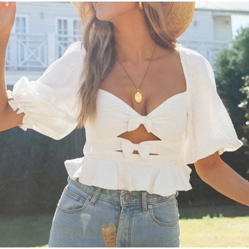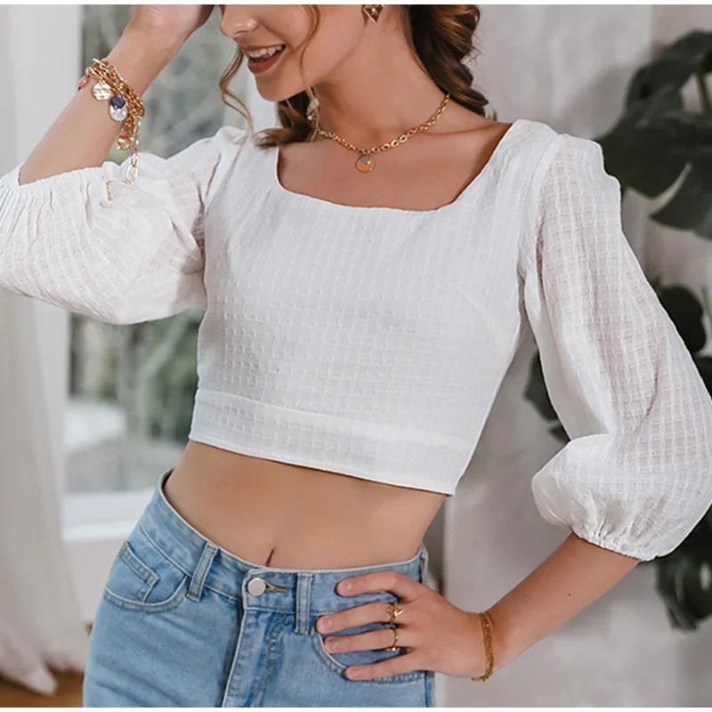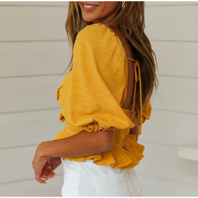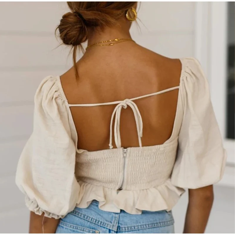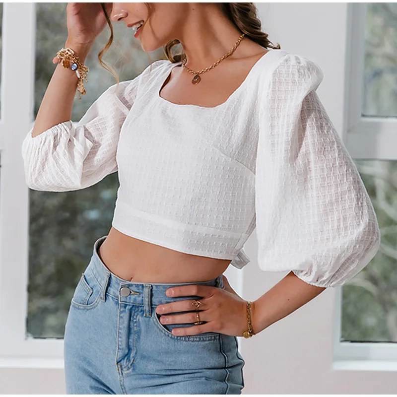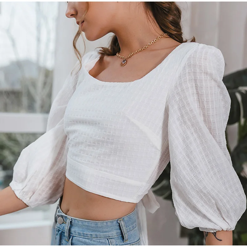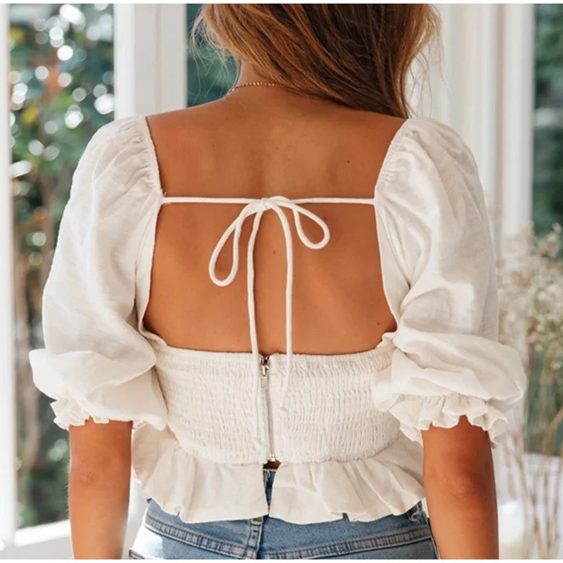 Женская короткая футболка с открытой спиной, квадратным вырезом и рукавами-фонариками, 2021