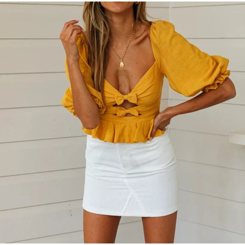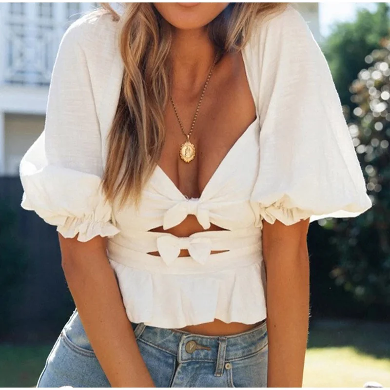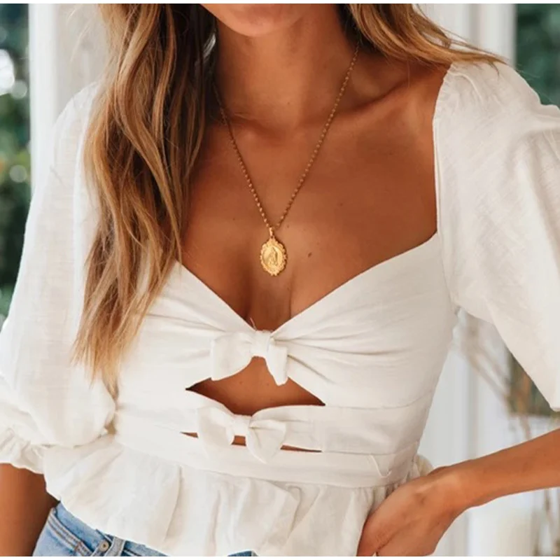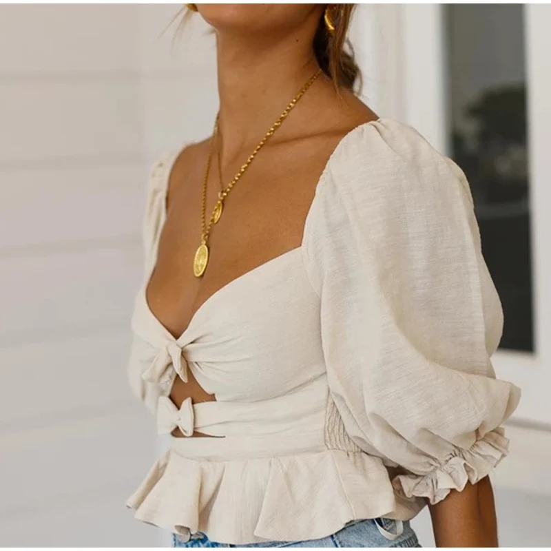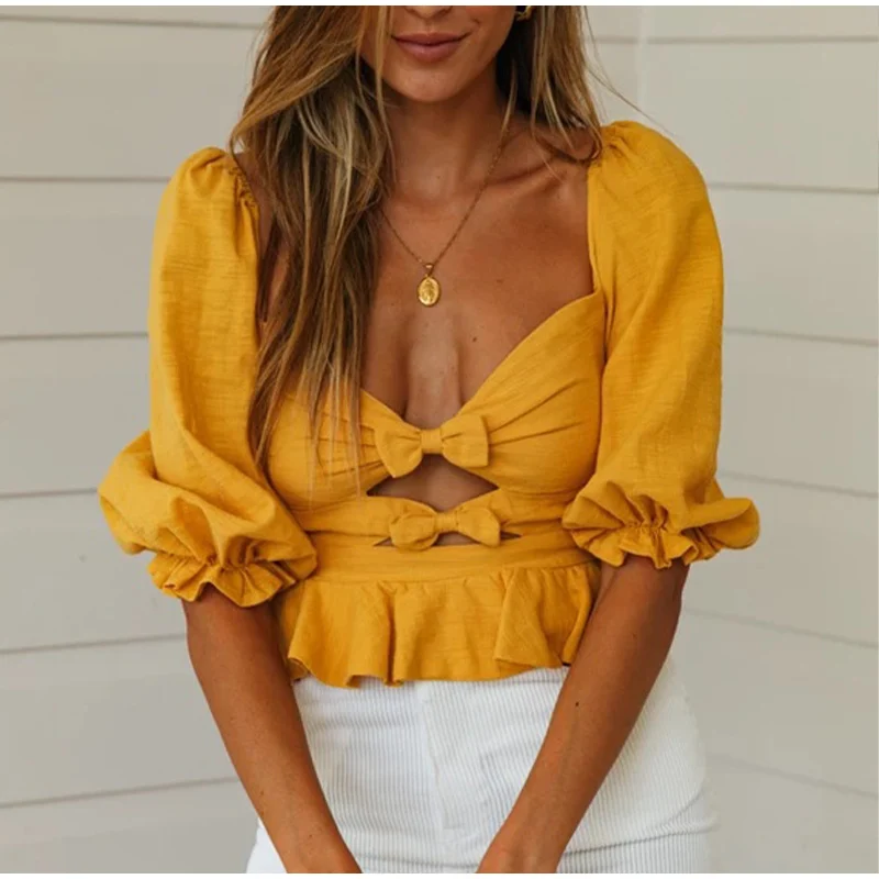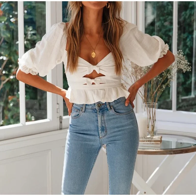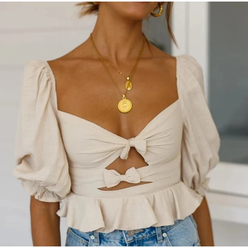 Женская короткая футболка с открытой спиной, квадратным вырезом и рукавами-фонариками, 2021