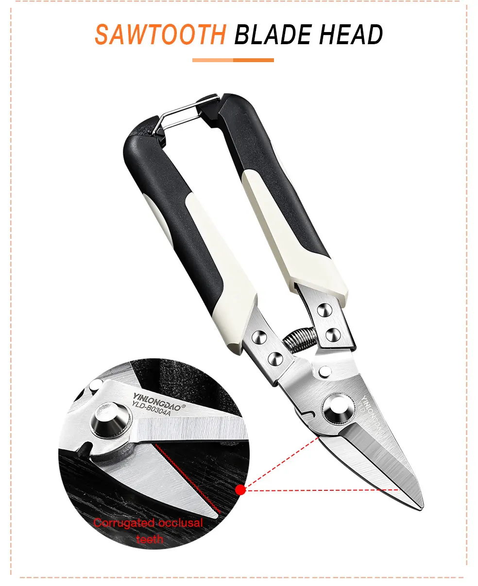 Особенности:1. Высококачественный материал из нержавеющей стали, маленький угловой край, подходит для твердых предметов.2. После высокочастотного закалки режущая кромка имеет остроту, с зачистки паза, и зубчатый край не скользит.3. Безопасная пряжка, самовсасывающая пружина удобна, а дизайн пряжки безопасен для хранения.4. Пластиковая ручка, удобная ручка, нескользящая и износостойкая.5. Подходит для садоводства и промышленностиПродукт включает в себя1 * ножницы для олова