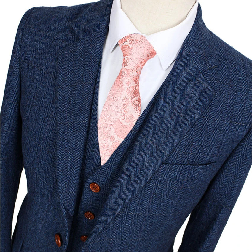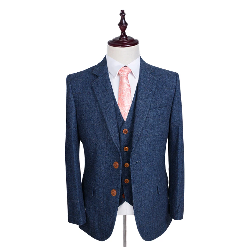 Шерстяные Синие Свадебные костюмы в елочку, мужские костюмы в стиле ретро джентльмена на заказ, синие костюмы (пиджак + брюки + жилет)