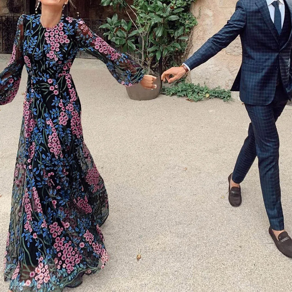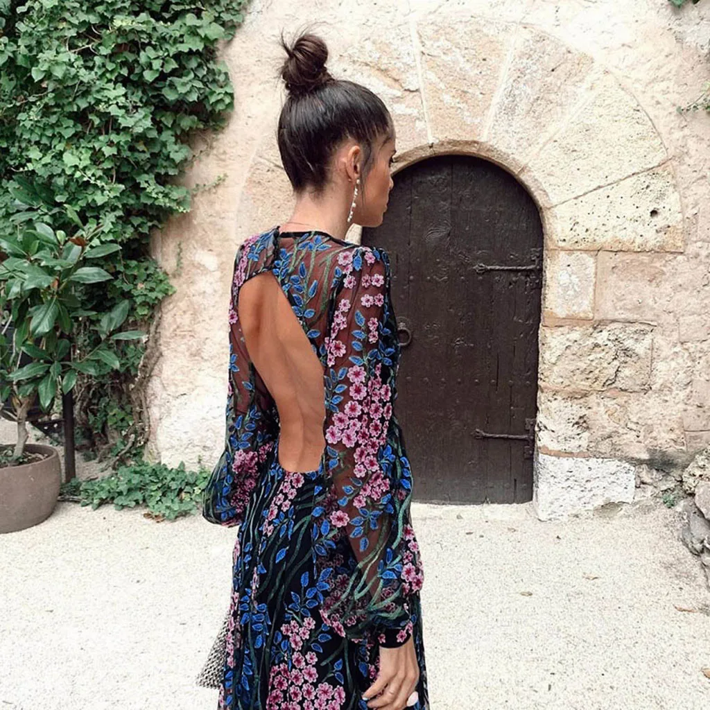 Женское кружевное вечерние с открытой спиной, длинное платье с длинным рукавом и круглым вырезом, с цветочным принтом, # J30