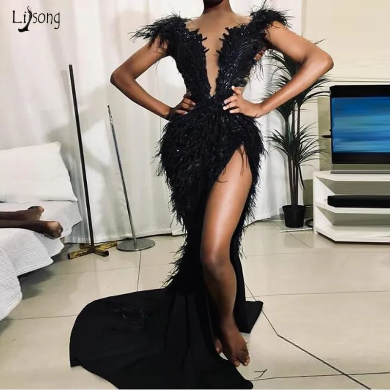 Женское платье-Русалка с V-образным вырезом, Черное длинное кружевное платье с высоким разрезом сбоку, платье для выпускного вечера, 2020