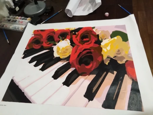 Краски не соответствуют цветам, картина. получилась мрачная, серая, и вешать на стену совсем не хочется.
