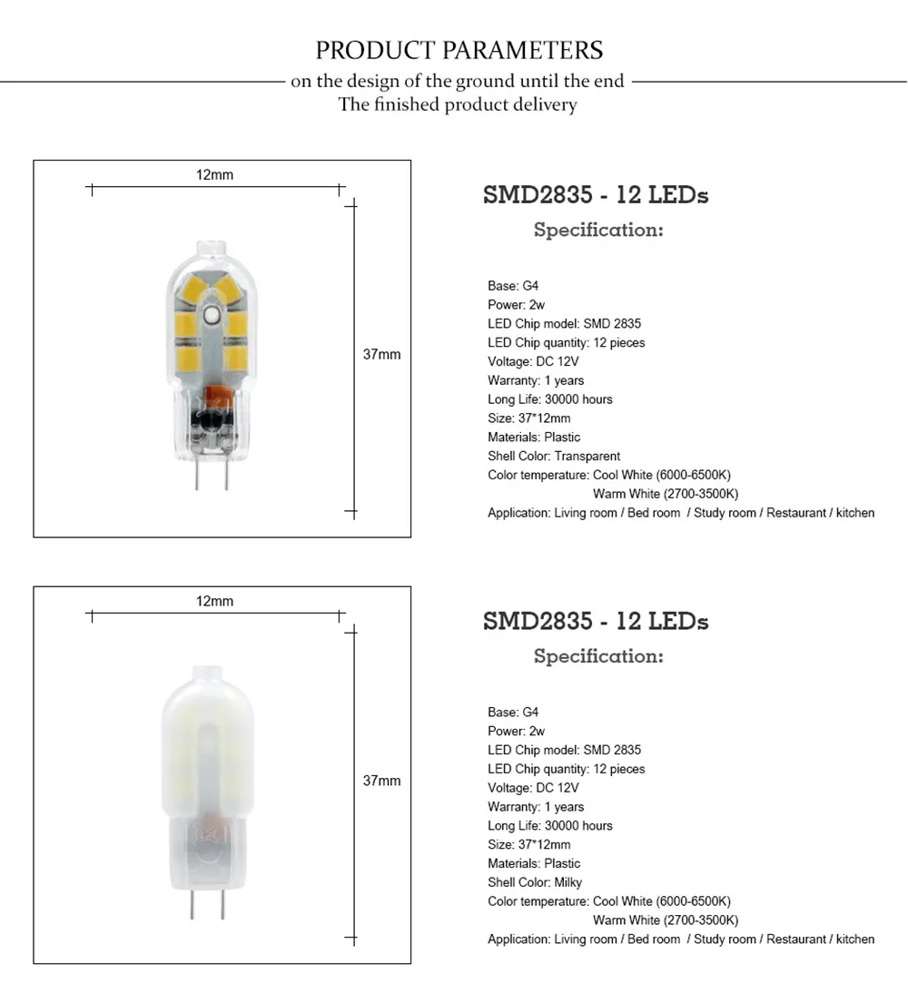 Основание Tpye: G4 Светодиодный чип: SMD 2835 Количество СВЕТОДИОДНЫЙ: 12 Светодиодный s Входное напряжение: ac220в/DC12V (Примечание: Пожалуйста, подтвердите необходимое напряжение перед покупкой.) Материал корпуса: поликарбонат Угол луча: 360 Особенности: AC DC 12V, идеальная замена G4 галогенная лампа непосредственно. Угол луча 360 градусов, это самый широкий угол для освещения. Счет экономии электроэнергии: заменить галогенную лампу 10-20 Вт, сохранить 70%-85% на счет электричества освещения. Простая установка: Стандартная база G4, может быть легко установлена вместо обычных галогенных ламп. Широкий спектр применения: подходит для хрустальных ламп, коридорных ламп, люстр, зеркальных передних ламп, настенных ламп и так далее.