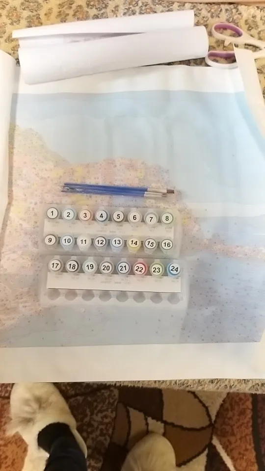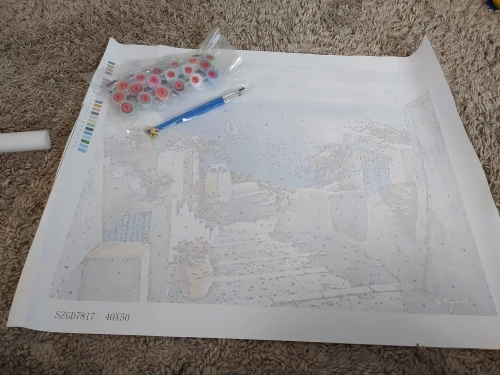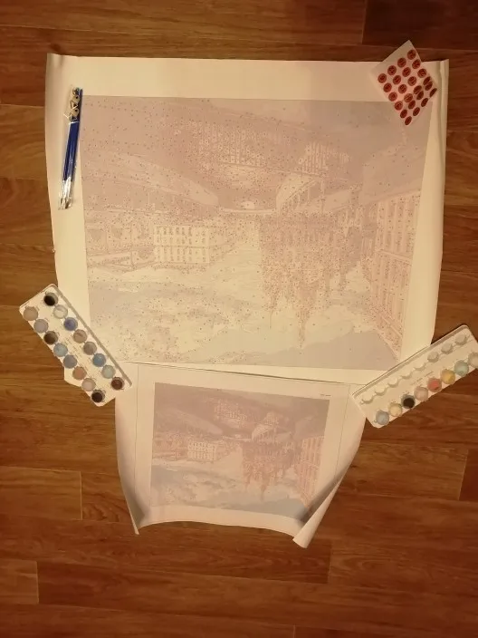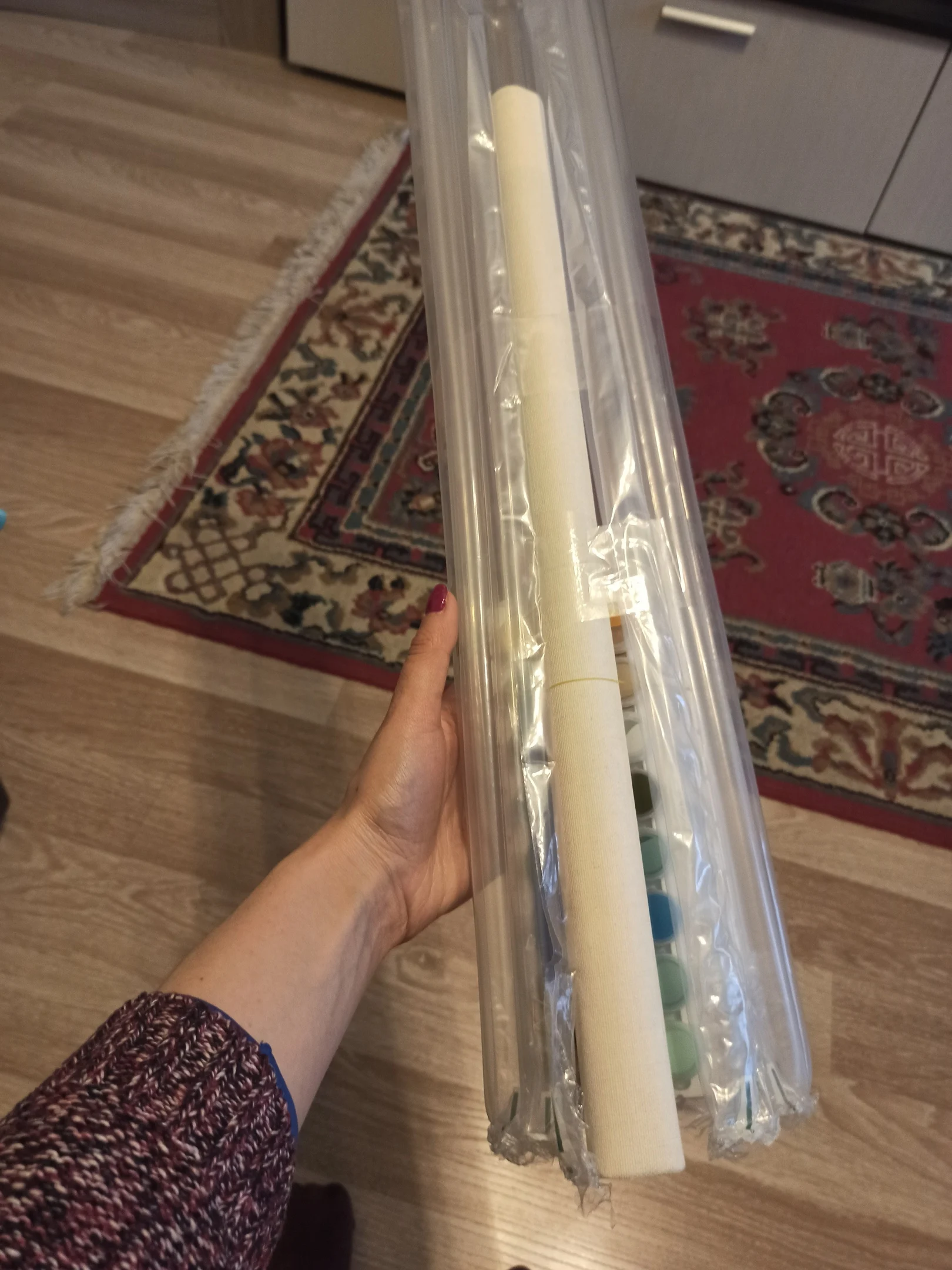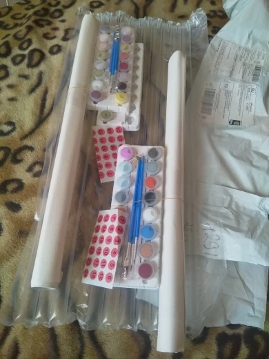 Полотно слегка помято, хотя в надежной упаковке. Все краски, кисточки на месте. Шло достаточно долго, получил на почте впритык 31 декабря :) Спасибо!