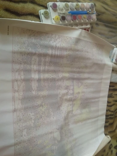 Изображение напечатано на холсте, а не на бумаге. К сожалению, это при транспортировке слегка мнется. Мы надеемся, что вы будете чувствовать себя гладкими. Цвета отличные, также есть кисти. Я доволен покупкой!