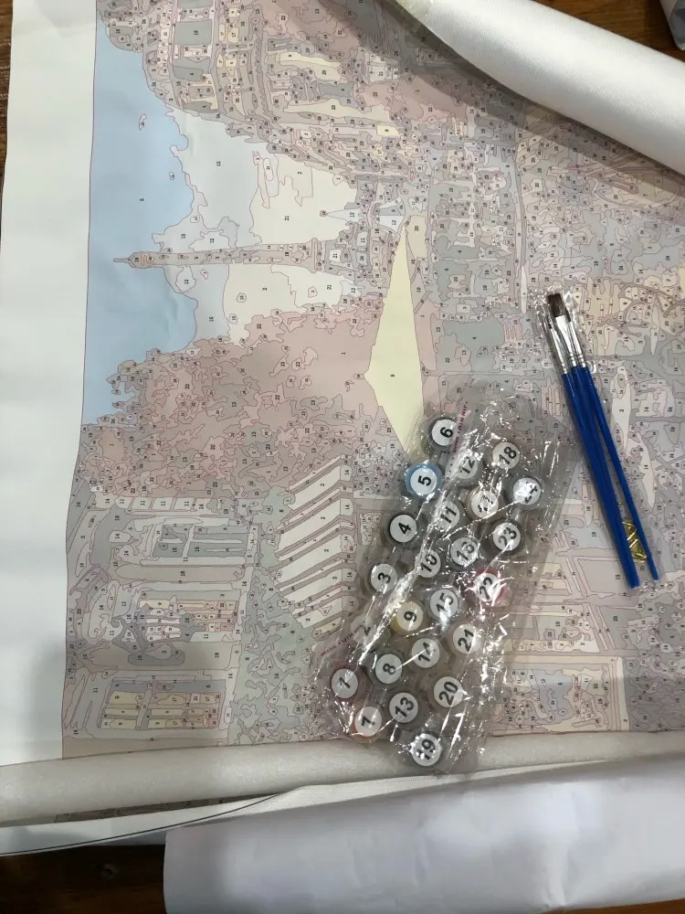 Цветное полотно и бумажная схема с четко пропечатанными номерами.Завернуто в трубочку с вкладками, поэтому не помялось при доставке