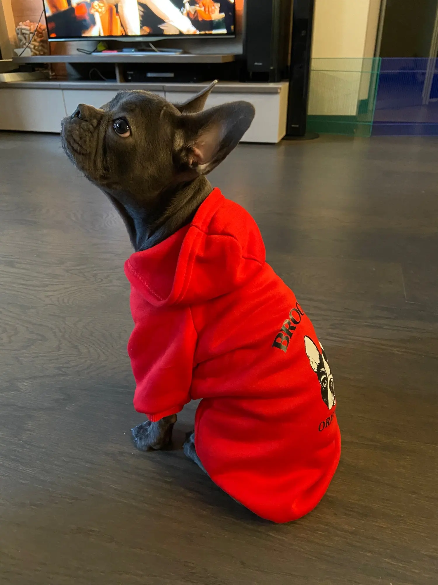 На французского бульдога 4 мес и 7 кг, толстовка к сожалению мала. Отдам коту, пусть носит. По качеству все нравится, ща такие денежки просто подарок