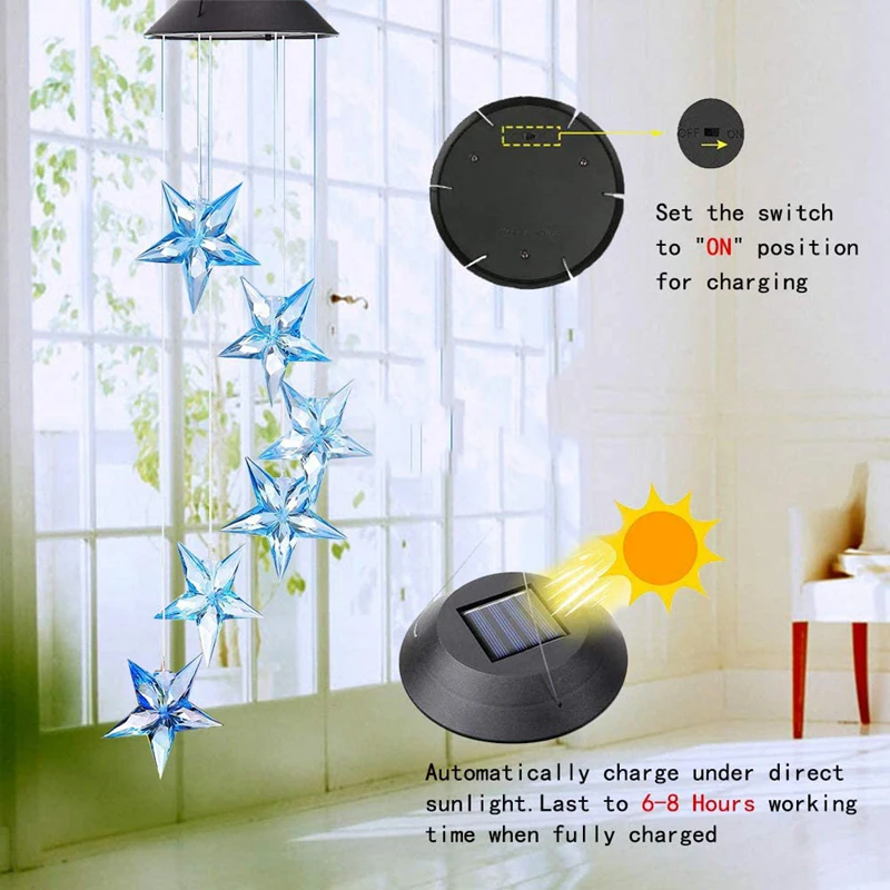 Long Working Time: Set the switch which is located underneath of solar panel to "ON" position for charging. The solar wind chime light could last up to 6-8 hours with fully charged during the day.