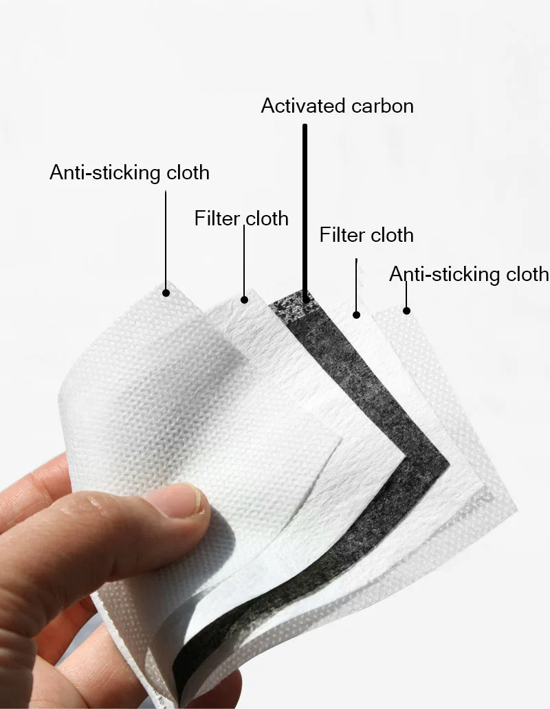 1. Материал: ПП антиприклеиваемая ткань + мелтдувная ткань + ткань из активированного углерода