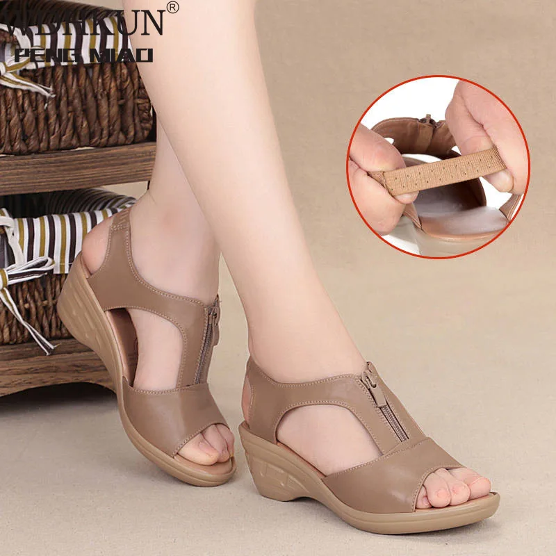Сандалии женские кожаные на платформе, босоножки на высокой танкетке, повседневная однотонная обувь на молнии, большие размеры 35-41, лето