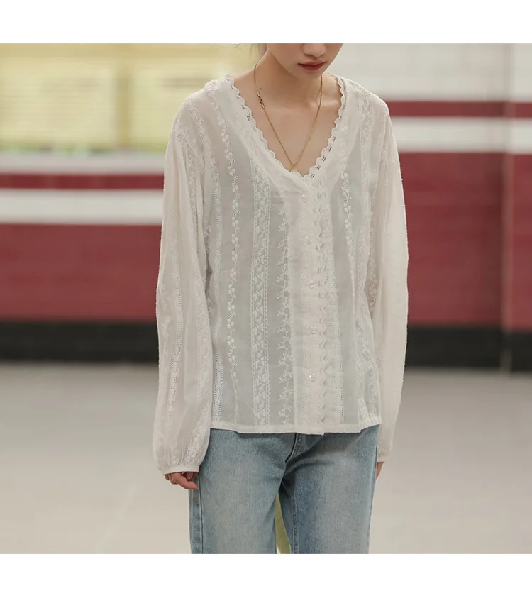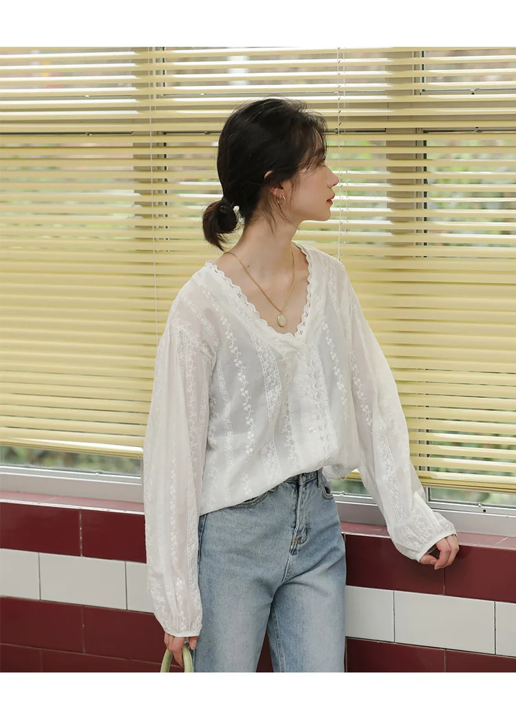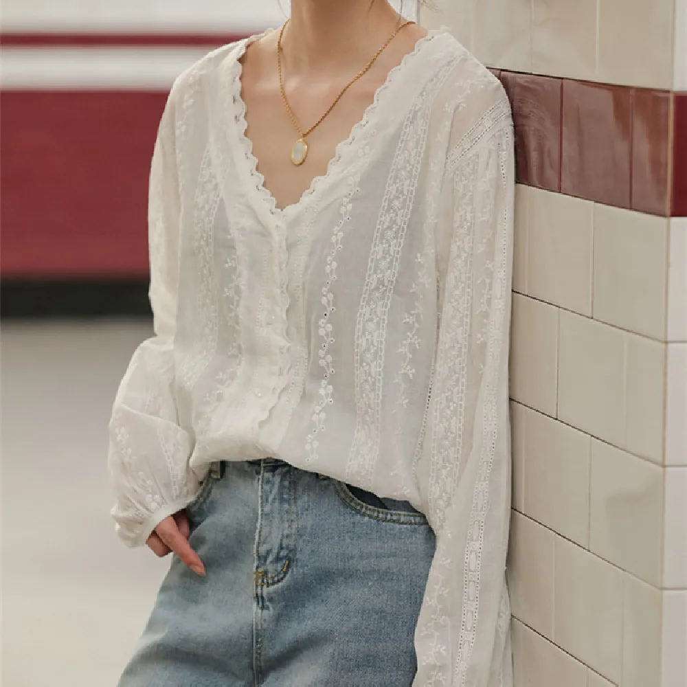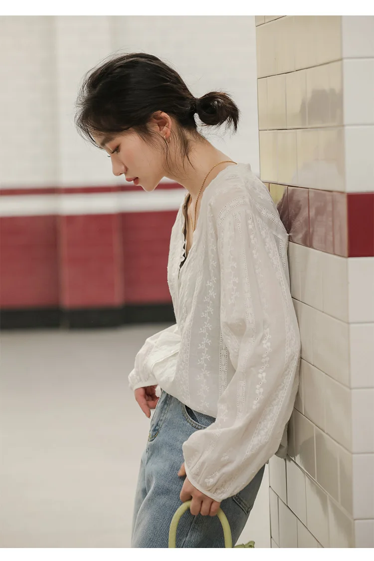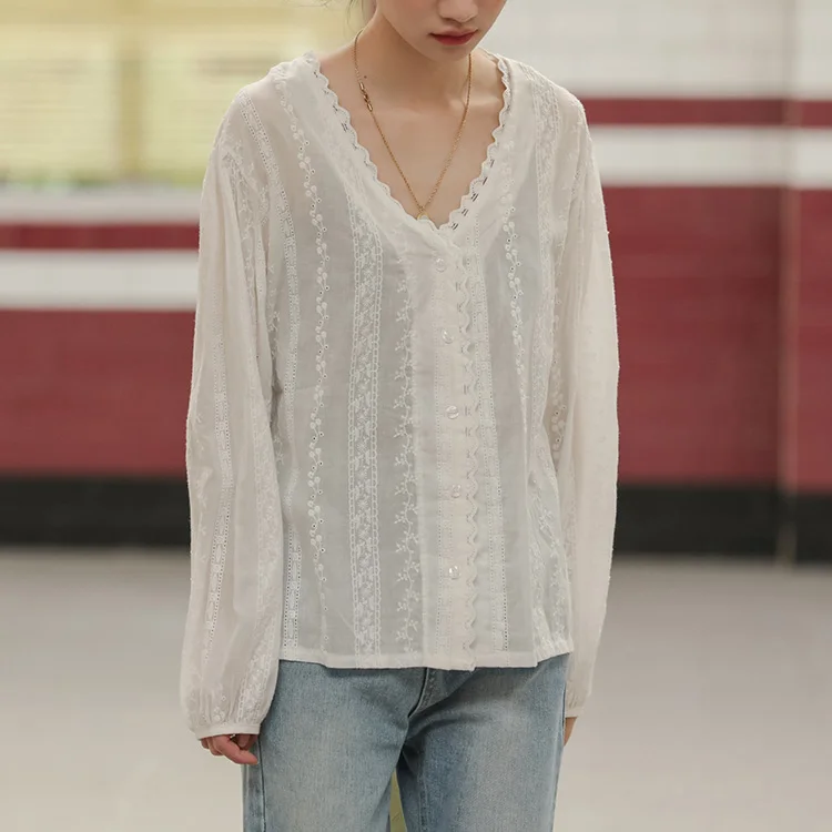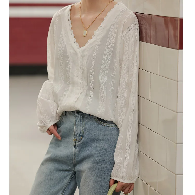 Кружевная белая женская блузка с вышивкой, летние женские топы, Повседневная Женская блузка, рубашка с длинным рукавом из льна и хлопка для девочек, Новинка
