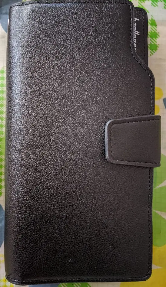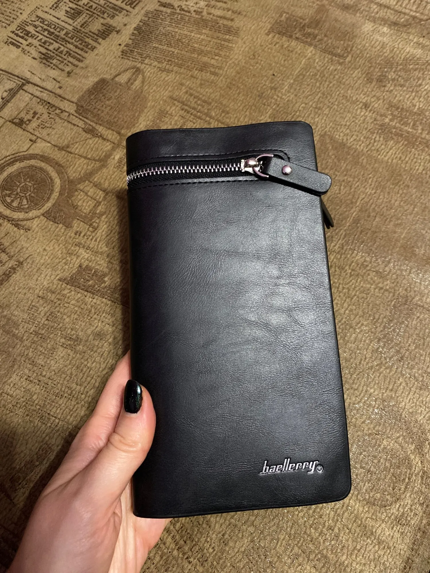 Отличный мужской кошелек. Стильный и вместительный. Помещается redmi note 8 pro. Есть кармашек под мелочь и под карты. Сшит аккуратно. Качественный кожзам, по краям прорезинен. Резкий запах выветрился на второй день. Покупкой очень доволен.