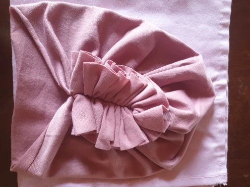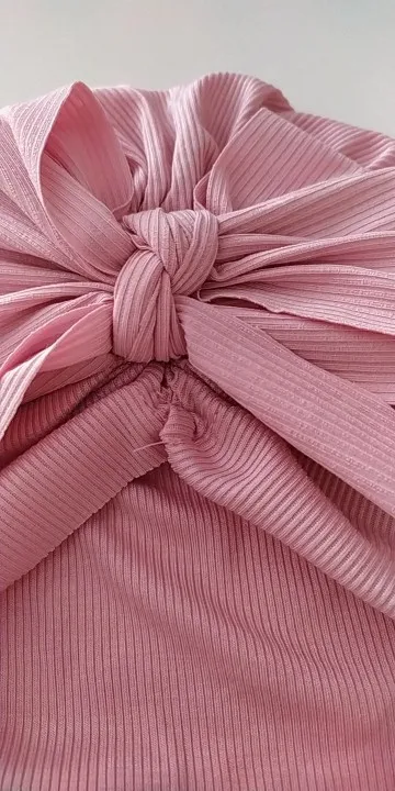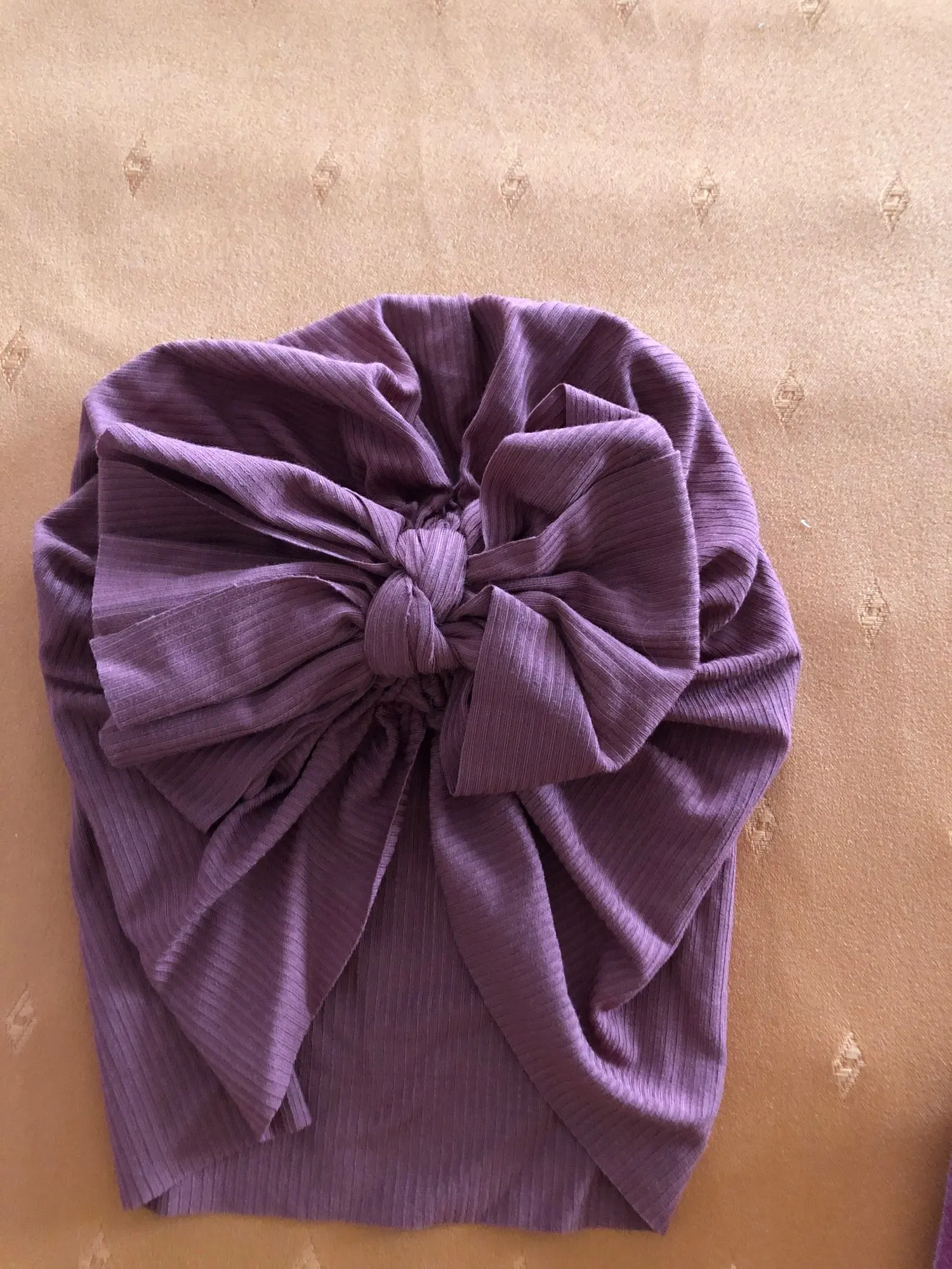 На ОГ 45 сидит свободно, ткань очень тонкая для тёплого лета подходит идеально. По отношению к основному изделию бабинка с бантом тяжёлая, поэтому периодически приходится поправлять сползающий тюрбан, бант плохо держит форму.