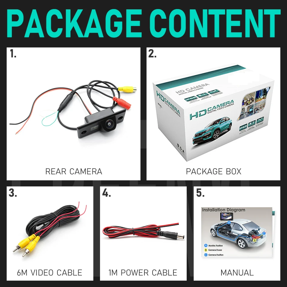 1. Задняя камера2. Коробка для посылка3. Видео кабель (6 м)4. Кабель питания5. Руководство пользователя