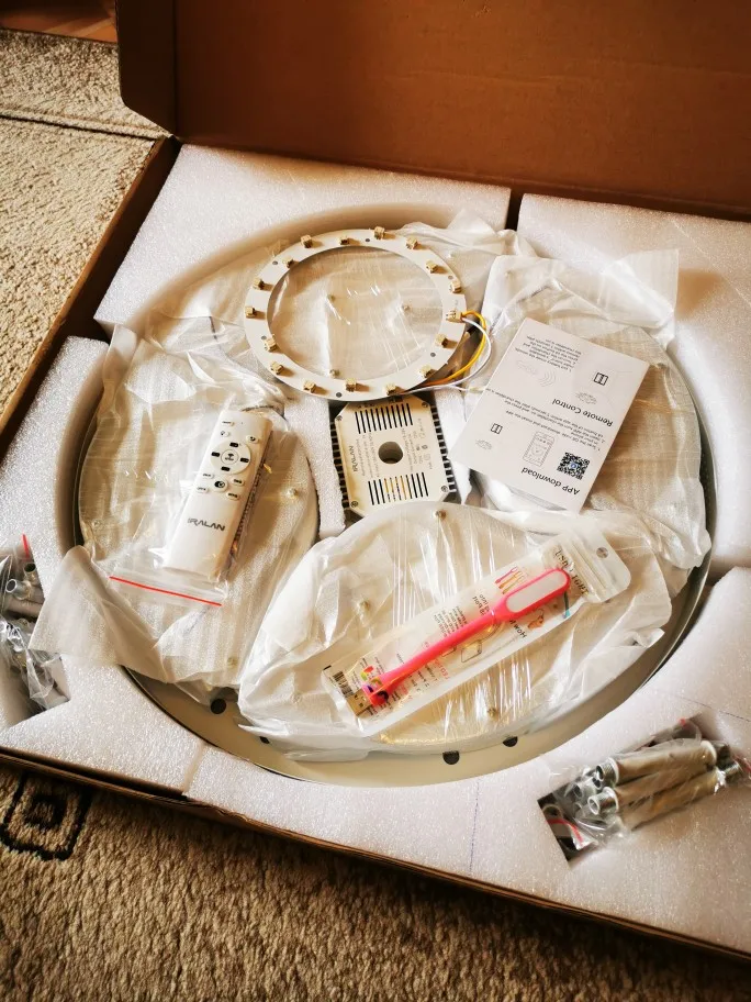 очень люстра понравилась ..доставили в срок компанией DPD..упаковано отлично, ничего нигде не помялось, каждая деталь свою упаковку имеет. собрала, подключила, пульт привязала.... всё работает!!!