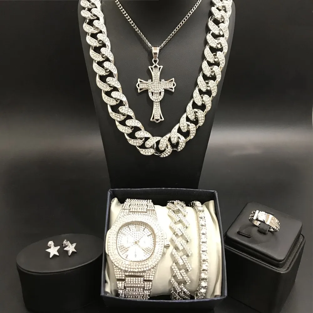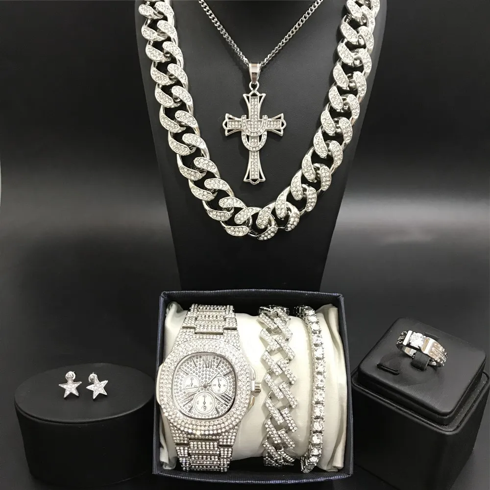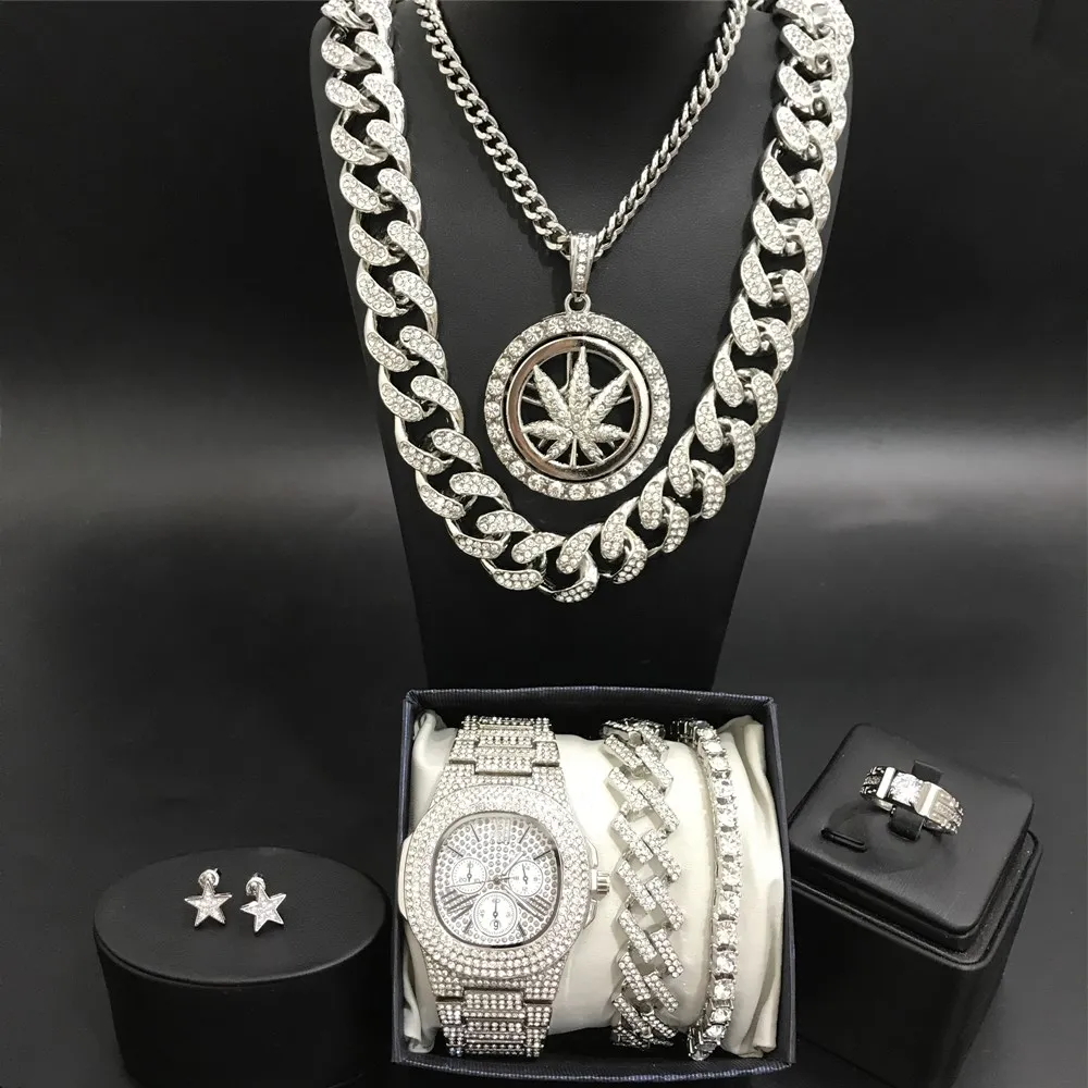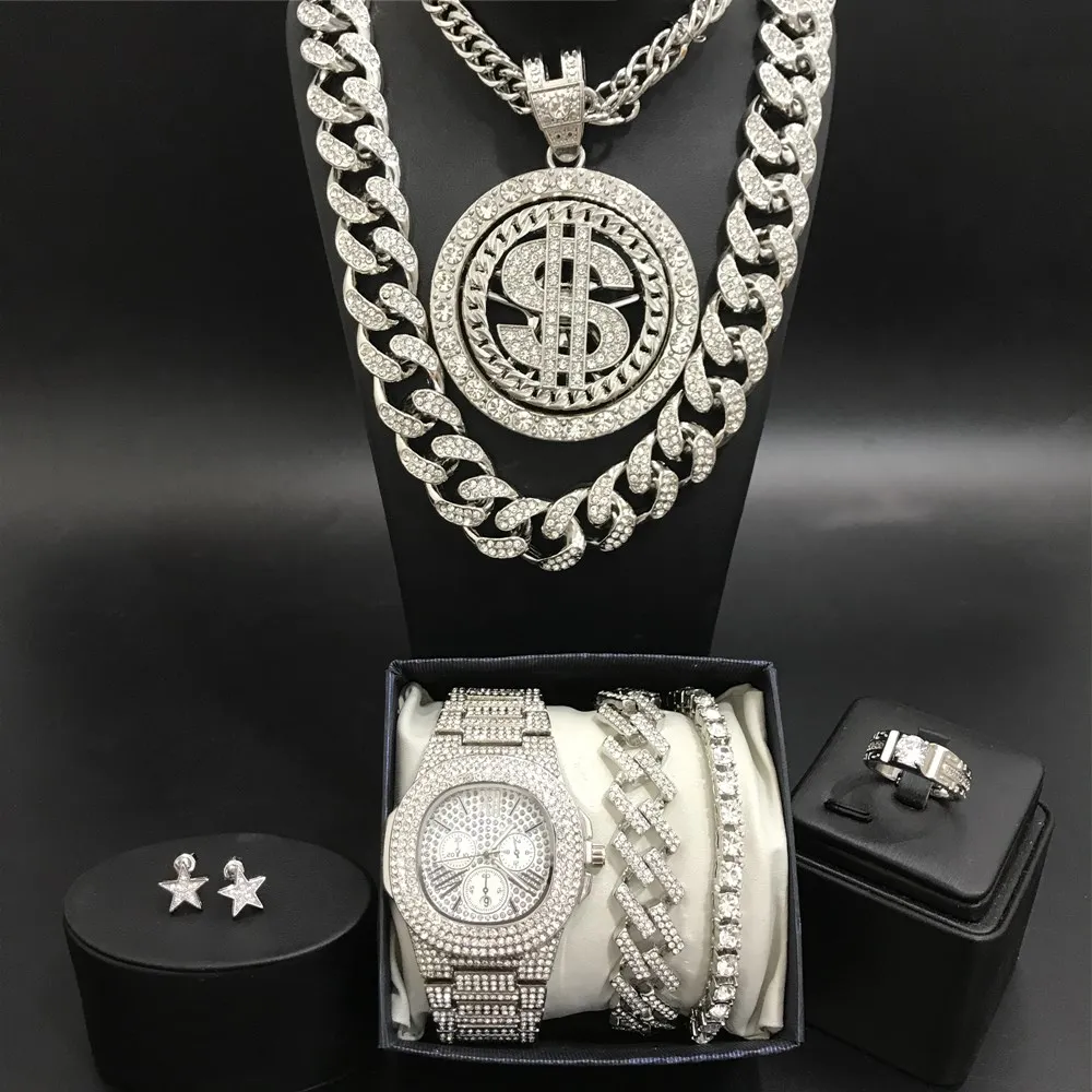 Мужское Ожерелье Майями с кристаллами в стиле хип-хоп, Роскошные мужские часы, ожерелье, кольцо и серьги, комбинированный набор в стиле хип-хоп, украшение для мужчин