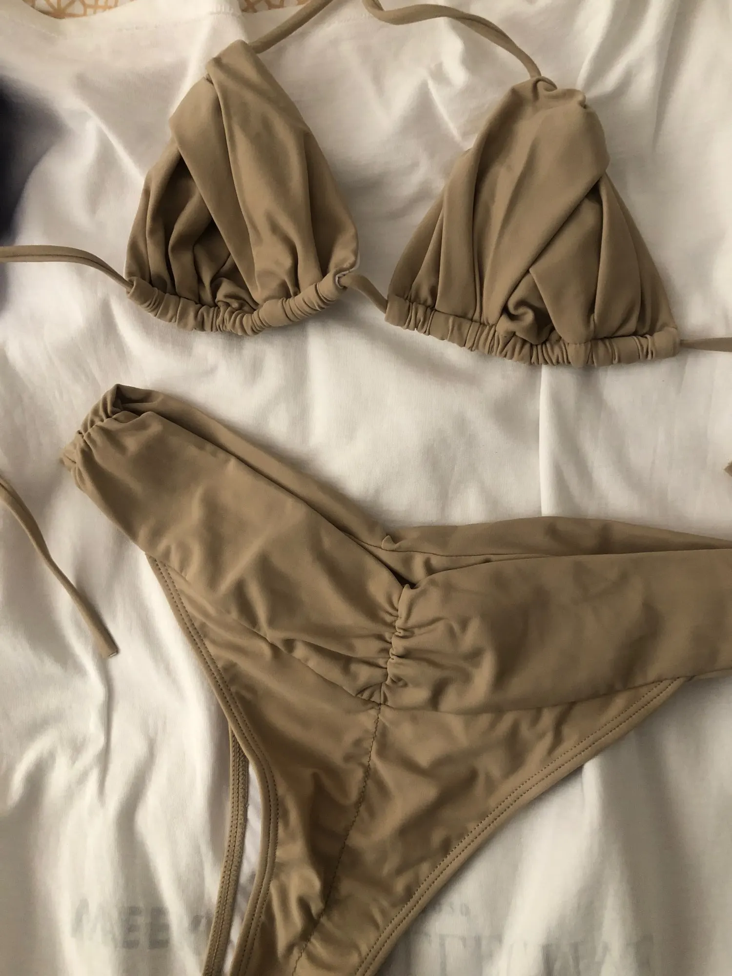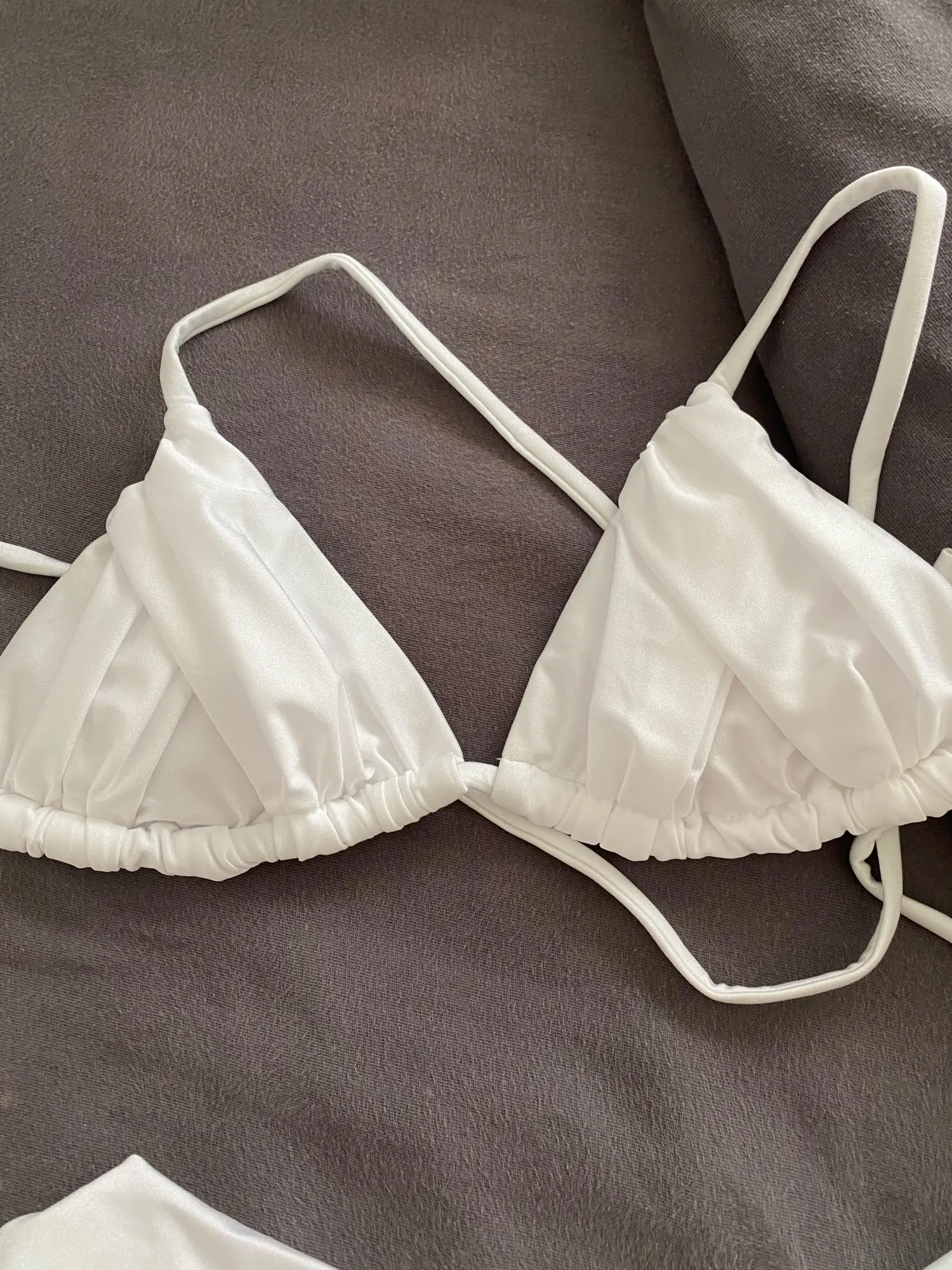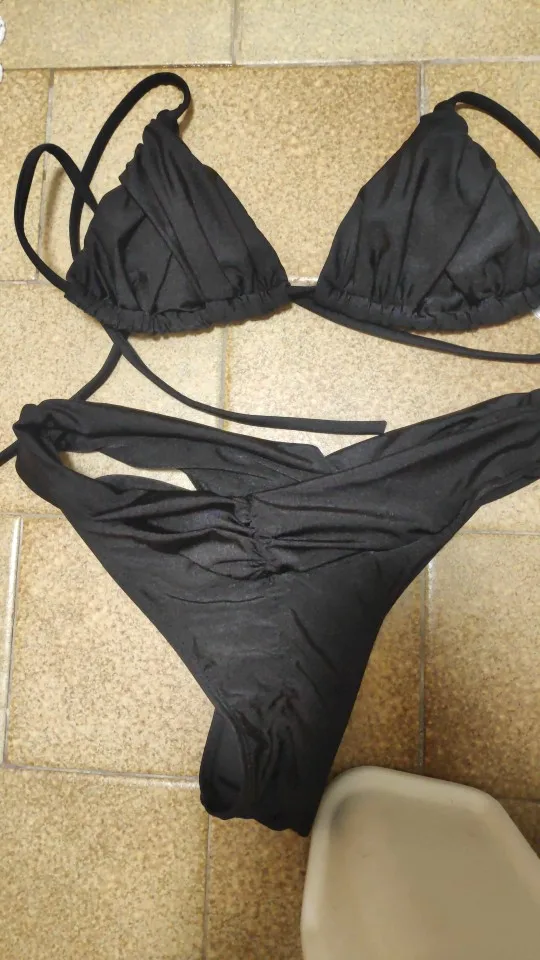 Это бикини не было блестящим или шелковистым, как на фотографиях. Топ хороший, но низ на мне большой и совсем не лестно.
