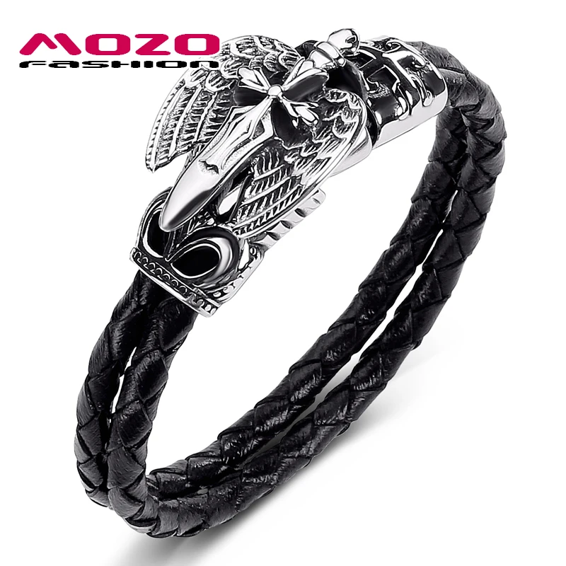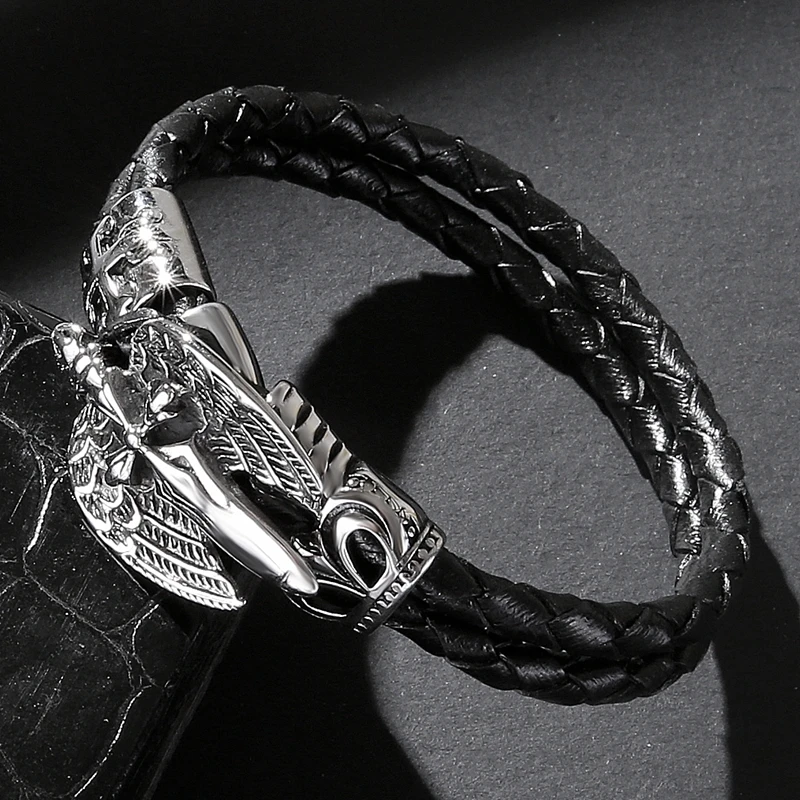 Мужской браслет из натуральной кожи, черный браслет из нержавеющей стали с крестом и крыльями меча в стиле панк, 2020
