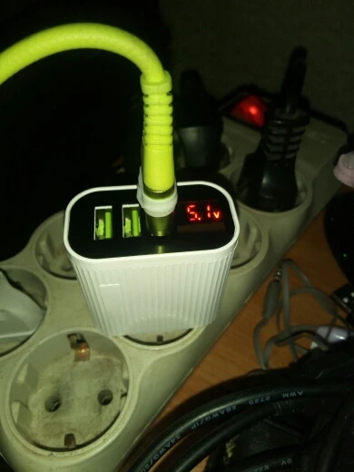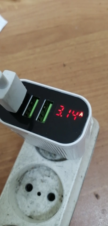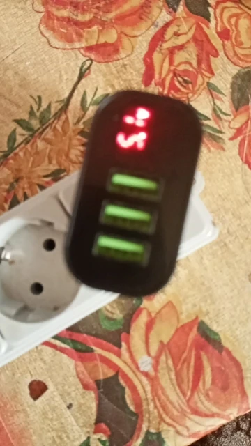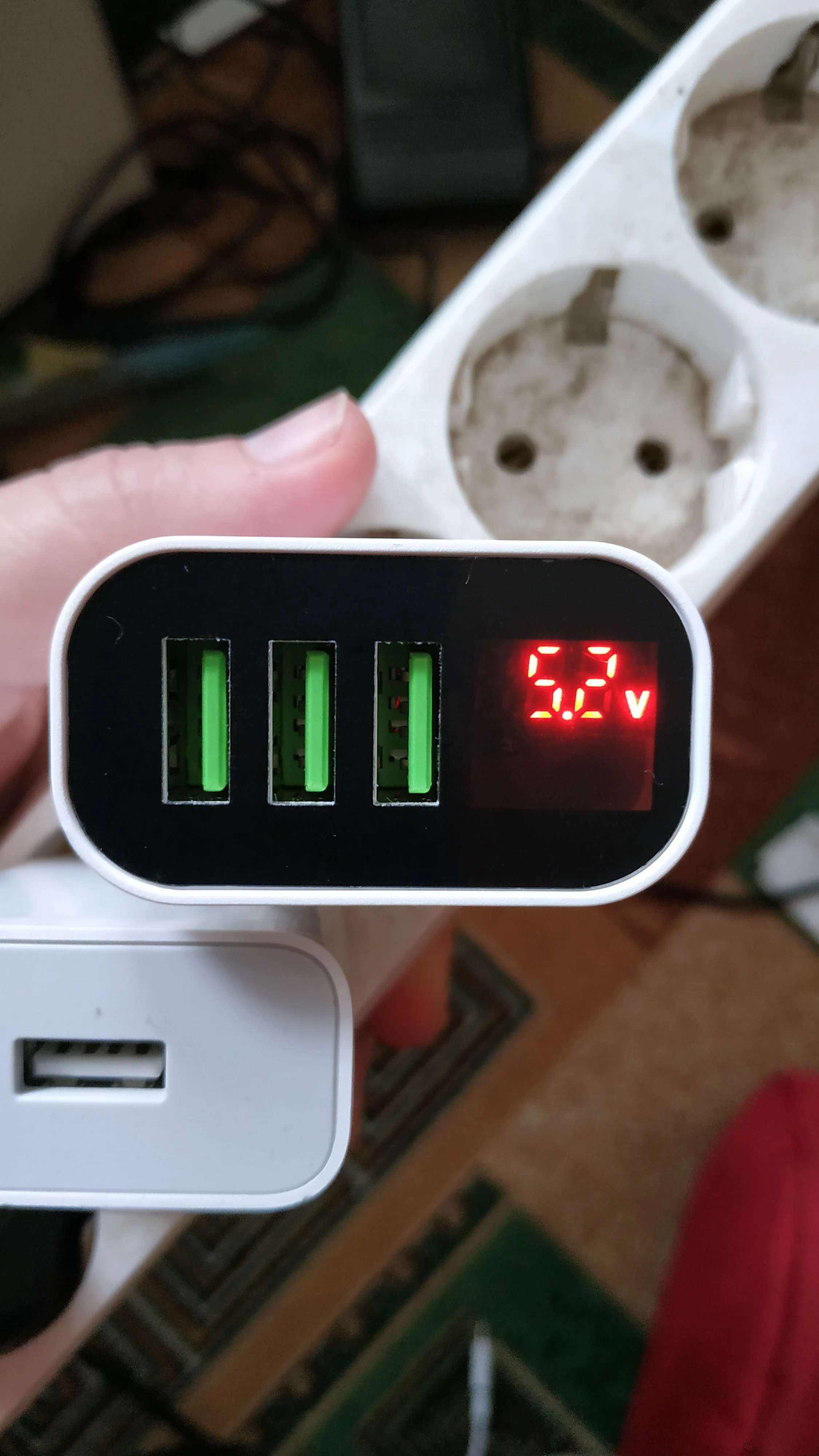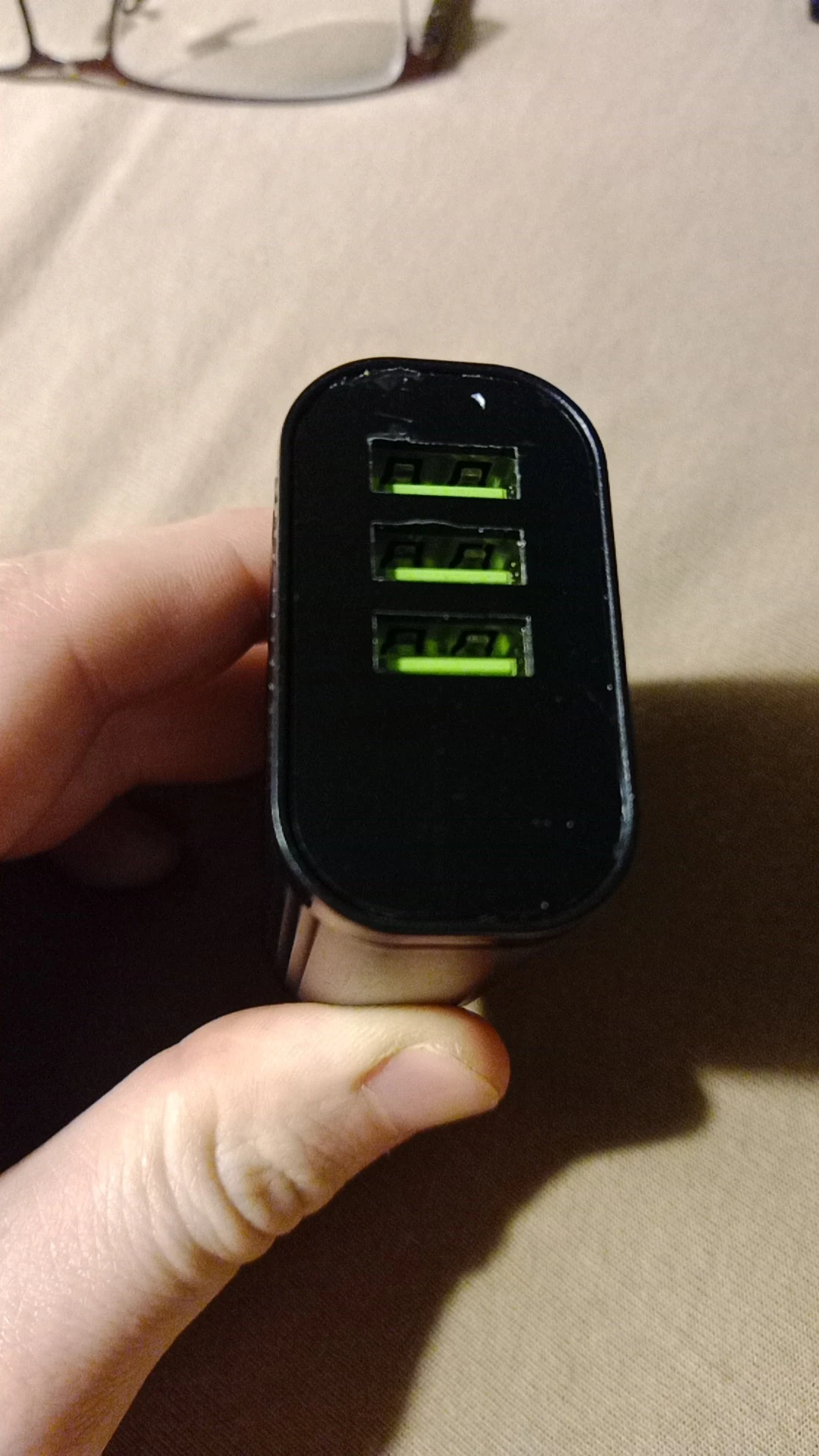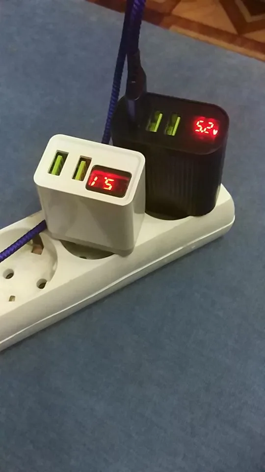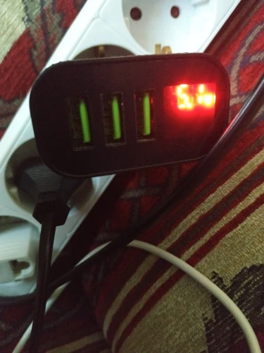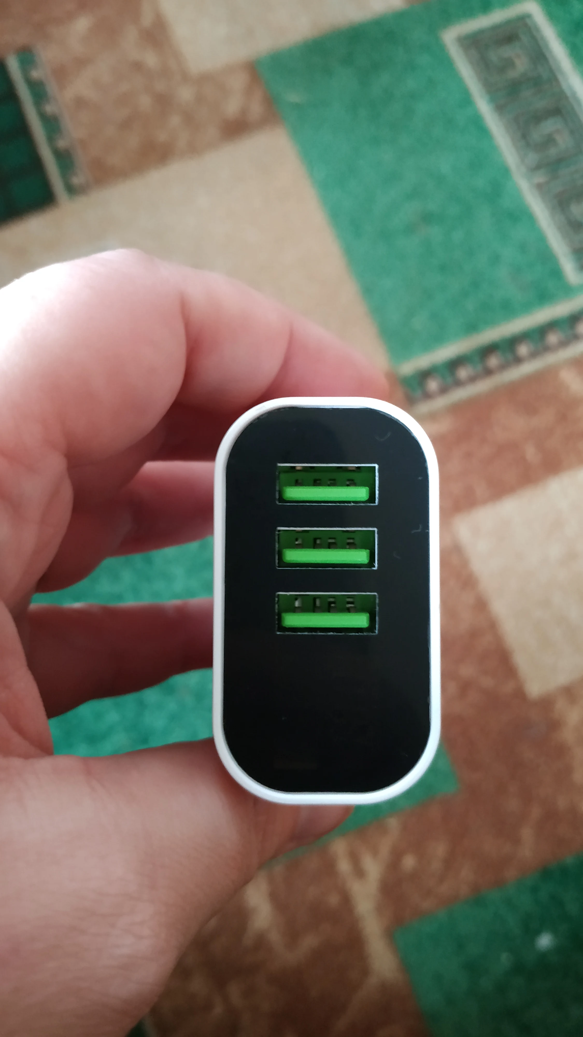 Взял самую дешёвую разновидность, за $2.5. Для определения максимально возможного тока зарядки подключил через измерительный прибор почти полностью разряженный смартфон. Нормально работает только оранжевый USB-порт - напряжение 5,2 Вольта при токе заряда в 1,2 Ампера. При переключении на зелёные порты прибор показывал совсем печальные цифры: напряжение 4,7 Вольта, ток 0,45 Ампера. При отключении нагрузки (смартфона) приборчик показывал напряжение 5,15 В на зелёных портах и 5,37 Вольта на оранжевом порту. Резюмирую: заявленным характеристикам устройство (по крайней мере дешёвая его разновидность, без встроенных индикаторов) НЕ соответствует, однако показало самый лучший результат среди нескольких десятков зарядников ценой меньше $3, которые прошли через мои руки и подверглись тестированию с использованием измерительного приборчика. Так что можно смело покупать (но использовать только ОРАНЖЕВЫЙ порт).