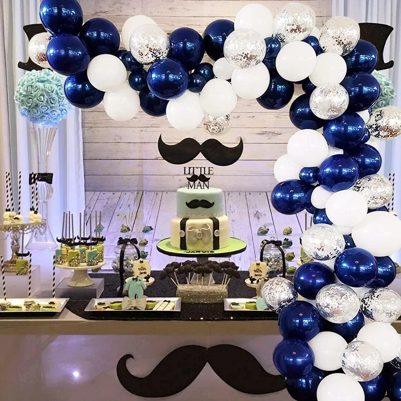 Воздушные шары с конфетти, Длинные темно-синие, белые, серебристые, арочный комплект, 112 шт.