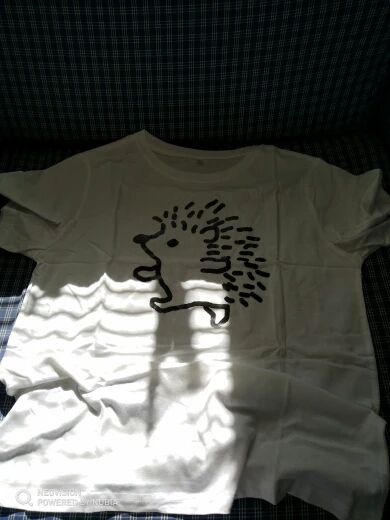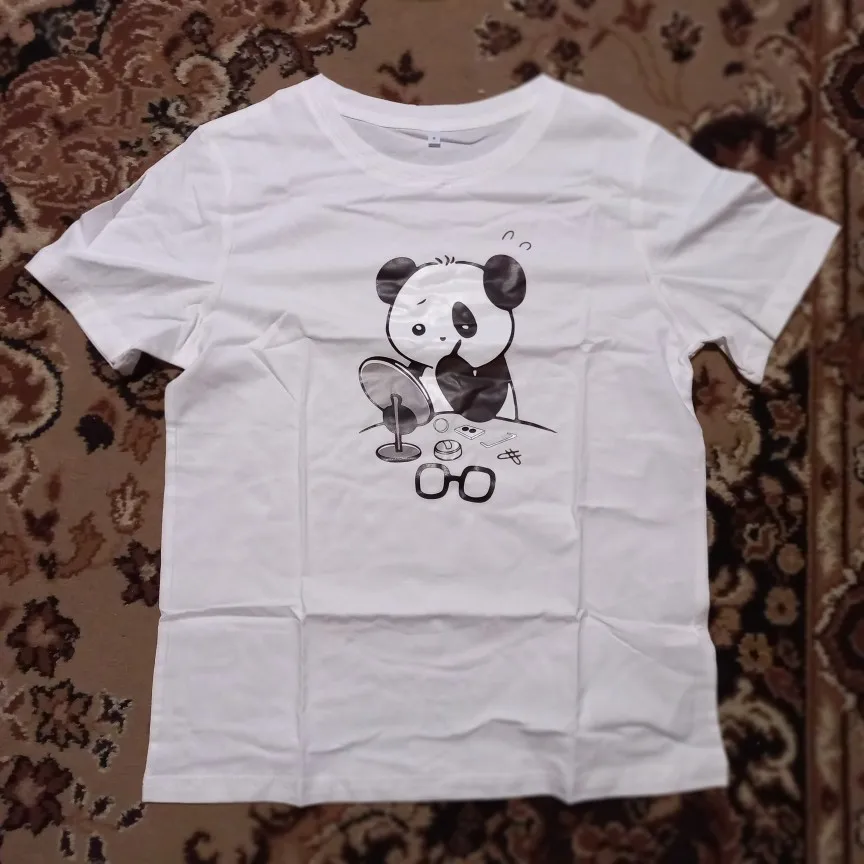 Футболка скорее молочного цвета. Рисунок приклеен сверху- слишком тонкий- на вид :либо полопается либо отойдет после первых стирок. Футболка огромная. На мои 88*65 она как мешок. Большая и в плечах тоже.По бокам на захват по 8-10 см....Не стоит даже таких денег.Ничего общего с фото продавца.