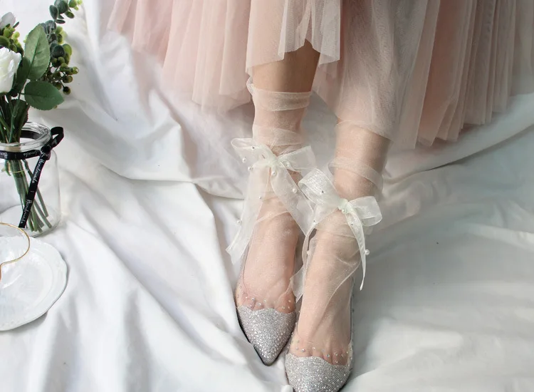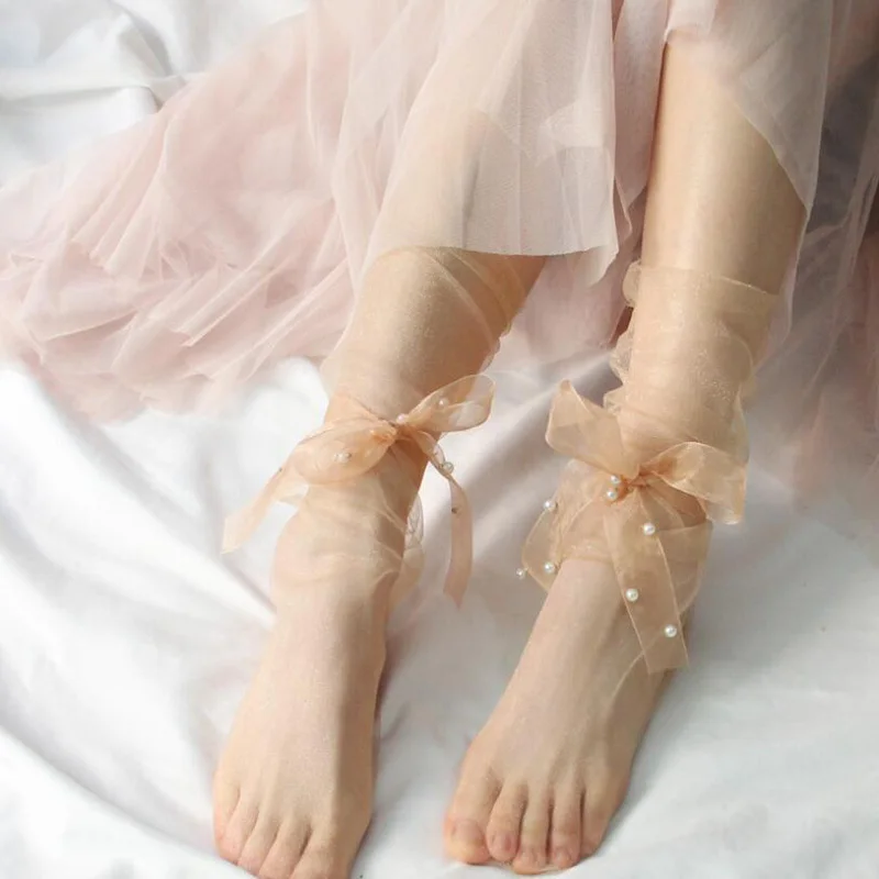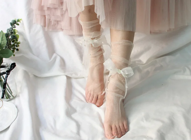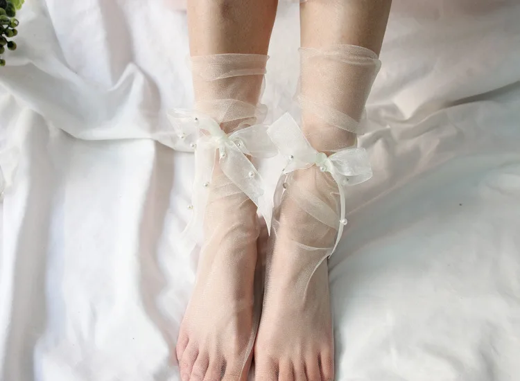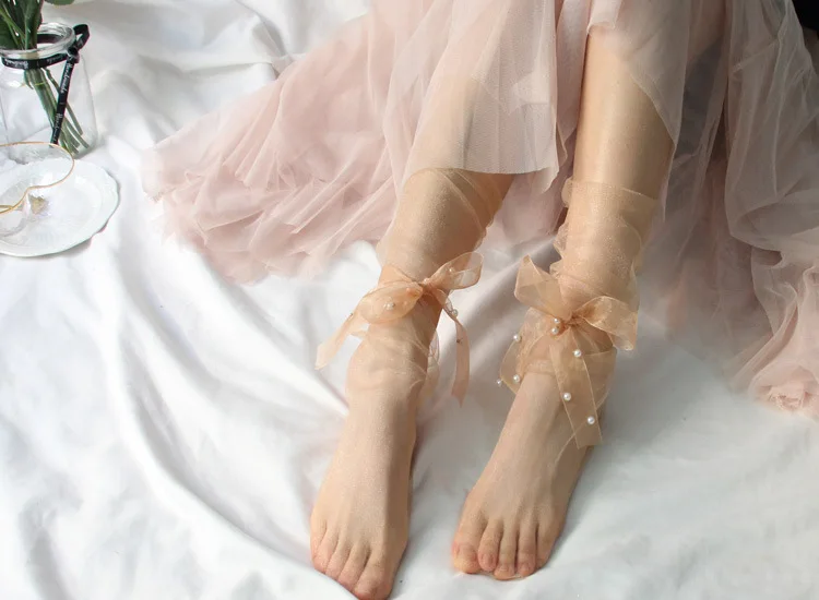 Носки женские, летние, ультратонкие, из тюля, прозрачные, с жемчугом