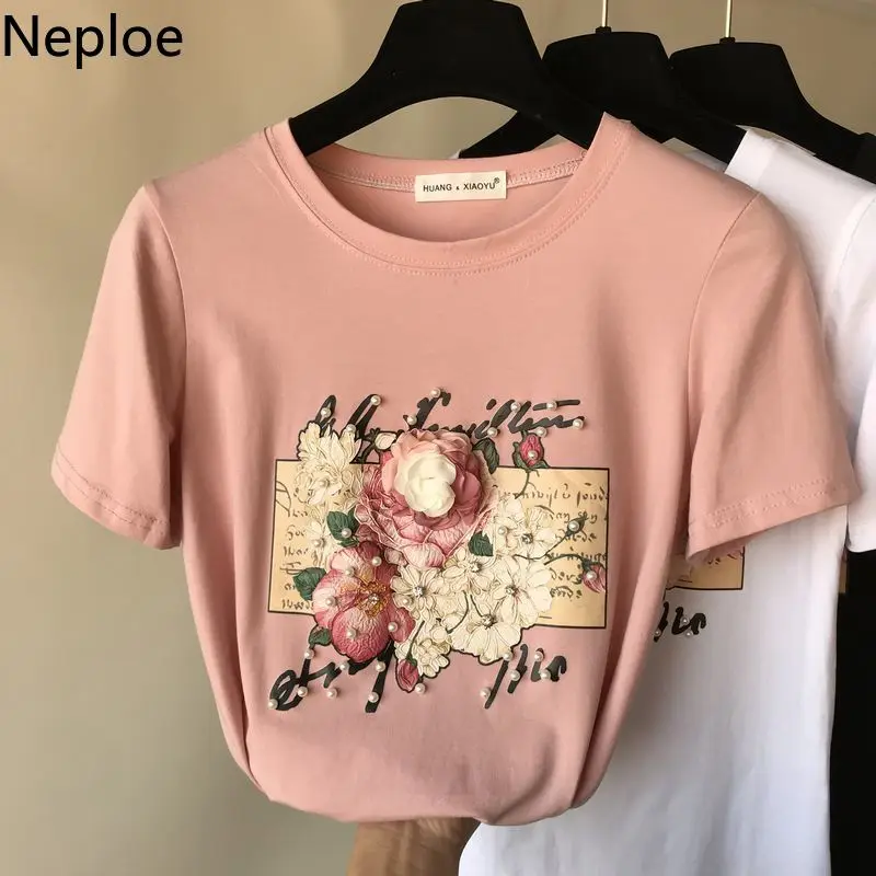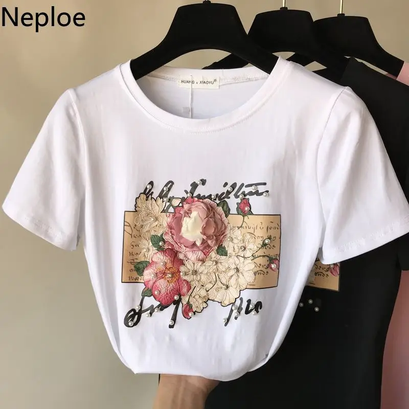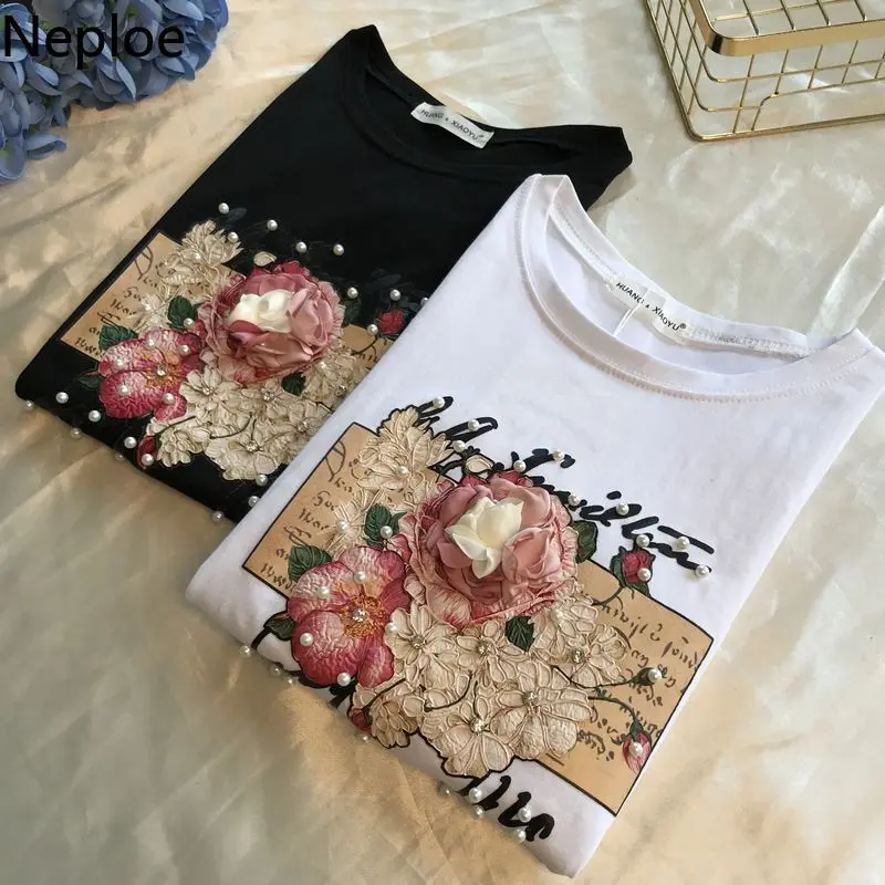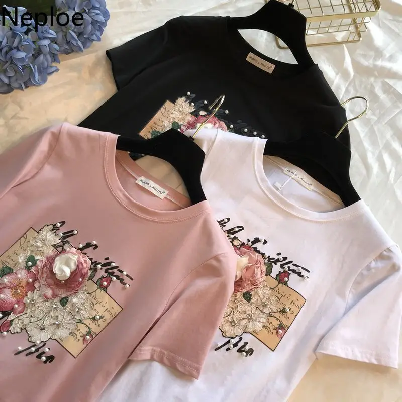 Neploe женская футболка с круглым вырезом и цветочной вышивкой Свободная Повседневная футболка с коротким рукавом женская летняя коллекция 2022 года хлопковый топ 1B271