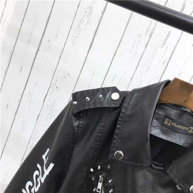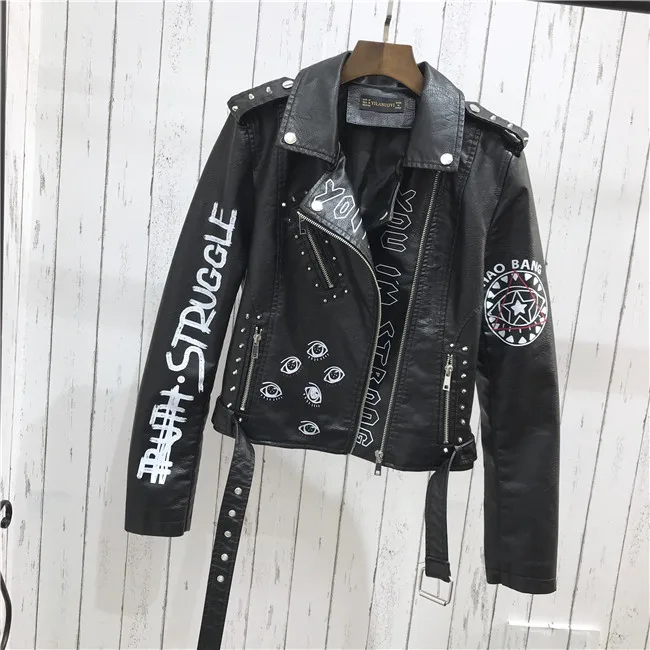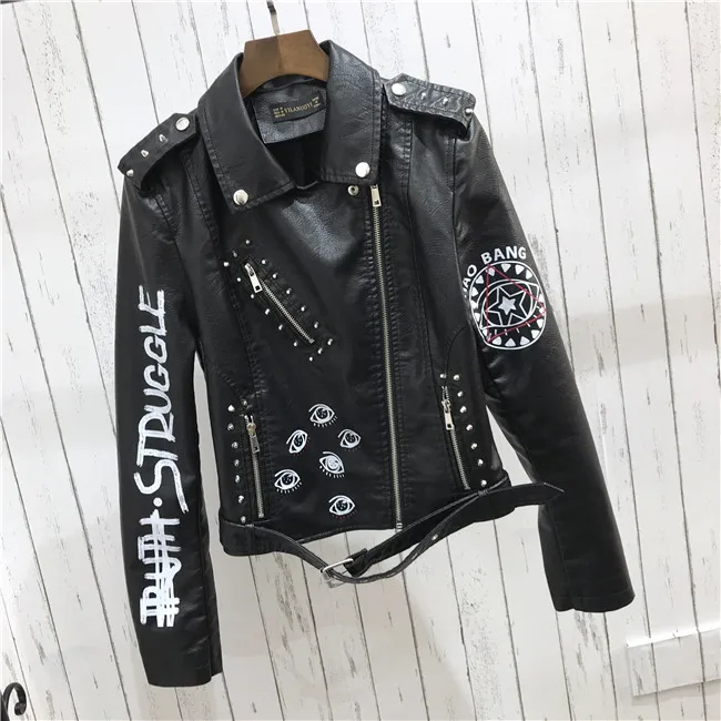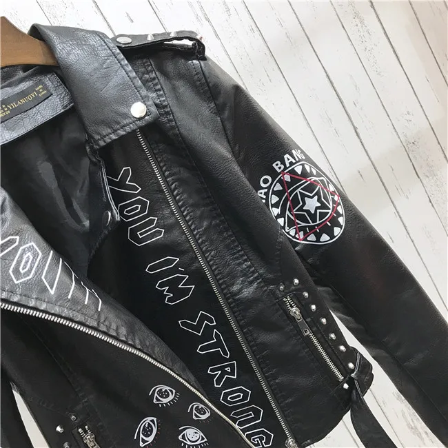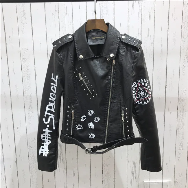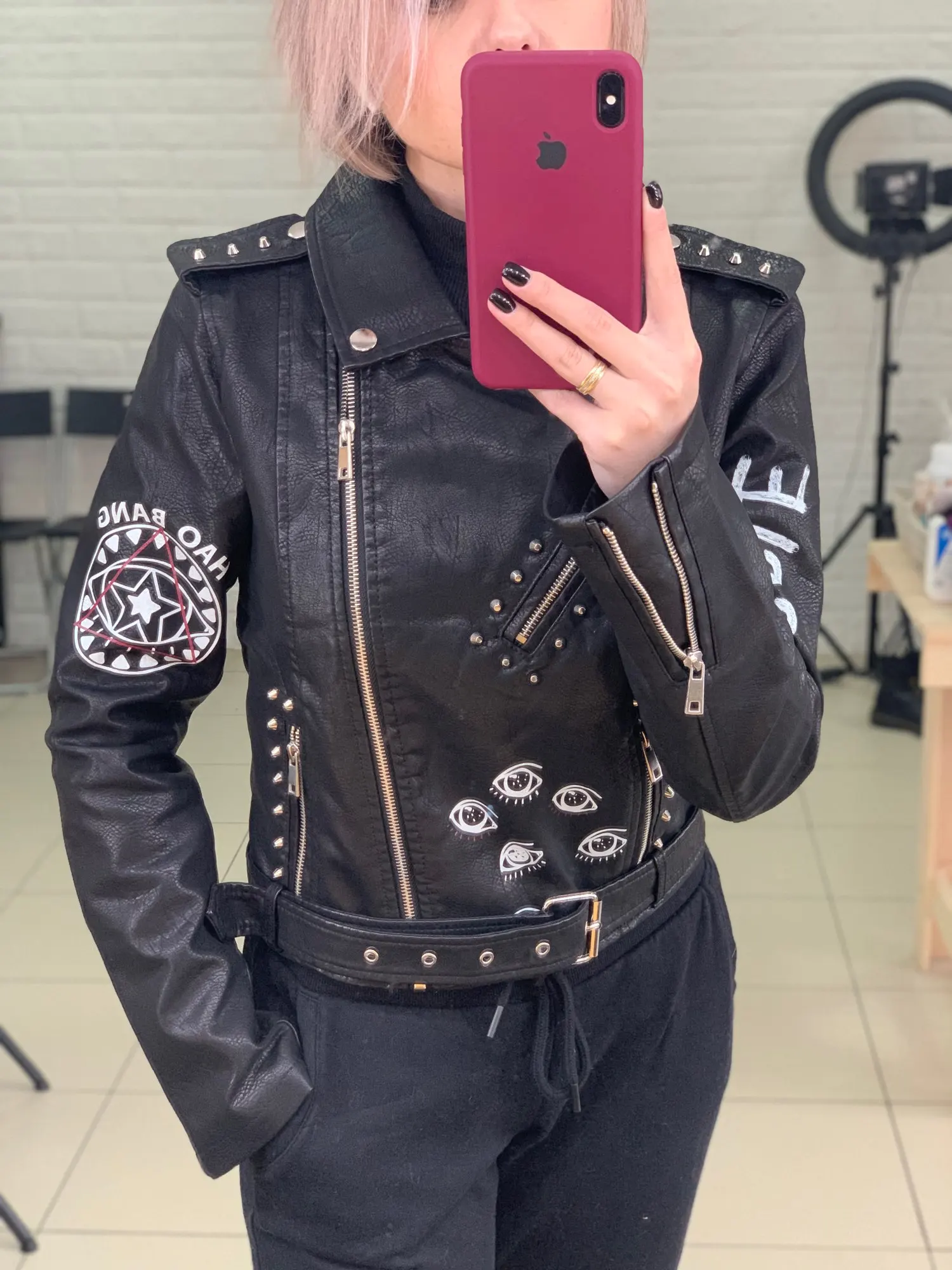 Куртка женская осенне-зимняя из искусственной мягкой кожи, черная, с заклепками, на молнии, с 3D-принтом, мотоциклетная уличная одежда, 2021